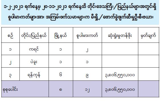 ၁-၂-၂၀၂၁ ရက်မှ ၂၀-၁၁-၂၀၂၁ ထိ အကြမ်းဖက်သမားများကြောင့် စူပါမားကတ် ပျက်စီးဆုံးရှုံးမှု အကြမ်းဖက်အဖွဲ့များအနေဖြင့် နိုင်ငံတော်ပိုင်နှင့် ပုဂ္ဂလိကပိုင်ပစ္စည်းများအား ယခုကဲ့သို့ မိုင်းထောင်ဖောက်ခွဲ၊ မီးရှို့ ဖျက်ဆီးခြင်းများ လုပ်ဆောင်နေမှုအပေါ် ပြည်သူ လူထုတစ်ရပ်လုံးအနေဖြင့် နိုင်ငံတော်ဖွံ့ဖြိုး တိုးတက် ရေးနှင့် တည်ငြိမ်အေးချမ်းရေး အတွက် ပူးပေါင်းကာကွယ်သွားကြပါရန်နှင့် အကြမ်းဖက် သမားများ၏ လှုပ်ရှားမှု သတင်းများကို ရရှိပါက နီးစပ်ရာလုံခြုံရေးတပ်ဖွဲ့ဝင်များထံသို့ လျှို့ဝှက်စွာ ဆက်သွယ် သတင်းပေးပို့၍ အကြမ်းဖက် သမားများ ရပ်တည်မှုမရှိနိုင်သည်အထိ ဝိုင်းဝန်းပူးပေါင်း ဆောင်ရွက် သွားကြပါရန် မေတ္တာရပ်ခံ သတင်းထုတ်ပြန်ထားကြောင်း သိရသည်။