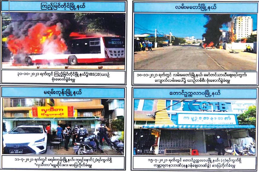 ဗိုလ်ချုပ်ဇော်မင်းထွန်းက မြန်မာပလာဇာတွင် ဆန္ဒပြမှုကို တွေ့ရ ပါကြောင်း၊ ယင်းမှာ ပိုင်နက်ကျူးလွန်မှုဖြစ်ကြောင်း၊ အများနှင့် သက်ဆိုင်သည့်နေရာတွင် ဆောင်ရွက်ခြင်းလည်းဖြစ် ၍ အကြံအစည်ဖြင့် ပြုလုပ်ခြင်းဖြစ်ကြောင်း၊ ခြိမ်းခြောက်ခံနေရသည်ကိုလည်း သိရကြောင်း၊ မိမိတို့အနေဖြင့် ခြိမ်းခြောက်ခံရမှုနှင့် ပတ်သက်၍ လုံခြုံမှုပေးနိုင်အောင် ဆောင်ရွက်ပေးလျက်ရှိ ကြောင်း၊ ယင်းသို့ ခြိမ်းခြောက်နေသည်မှာ လူနှစ်ယောက်တစ်ပိုင်းနှင့် ခြိမ်းခြောက် နေခြင်းလည်းရှိပြီး တကယ်လုပ်ရန်အတွက်ခြိမ်းခြောက်နေခြင်းလည်း ရှိကြောင်း၊ လူတစ်ဦးကို တစ်ဦးချင်း လုံခြုံမှုမပေးနိုင်သော်လည်း မိမိတို့အနေဖြင့် ပြည်သူလူထုအများစုအတွက် လုံခြုံရေးကို တတ်နိုင်သမျှ ဆောင်ရွက်ပေးနေပါကြောင်း၊ ယင်းသို့ဆောင်ရွက်ရာတွင် ပြည်သူလူထုကလည်း ဝိုင်းဝန်းကူညီပံ့ပိုးပေးရန် ပြောလိုပါကြောင်း၊ လုံခြုံရေးအမြင်၊ လုံခြုံရေးအသိနှင့်ပတ်သက်၍ လုံခြုံရေးတပ်ဖွဲ့သာ မဟုတ်ဘဲ သာမန်ပြည်သူလူထုများကလည်း သိသင့်ပါကြောင်း၊ သာမန်ပြည်သူလူထုအနေဖြင့် သိသင့်သည်များမှာ မသင်္ကာဖွယ်ရာ လူများ၏ အနေအထားက မည်ကဲ့သို့ရှိကြောင်း၊ မည်သည့်အချိန်တွင် မည်သည့်နေရာကို မသွားသင့်ဘူးဆို သည့် သာမန်လုံခြုံရေးအသိများကို အားလုံးက ဆောင်ရွက်ရမည်ဖြစ်ကြောင်း၊ လုံခြုံရေး ဆောင်ရွက်ရာတွင် ပေါ်ပေါ်ထင်ထင် မြင်ရသည့်နေရာများ၌ ယူနီဖောင်းနှင့်ရပ်ပြီး စောင့်ပေးနေတာ မဟုတ်ကြောင်း၊ မိမိတို့အနေဖြင့် သက်ဆိုင်သည့် | လုံခြုံရေးလုပ်ငန်းများကို ကျယ်ကျယ်ပြန့်ပြန့် ဆောင်ရွက်နေသည်ကို ပြောလိုကြောင်း၊ ထိုသို့ဆောင်ရွက်နေမှုကြောင့် ရန်ကုန်မြို့၌ ရှိနေသည့် အဖွဲ့အစည်းကြီးများ၊ လက်နက်များကို မိခဲ့ခြင်းဖြစ်ကြောင်း၊ လုံခြုံရေးတပ်ဖွဲ့များအနေဖြင့် တတ်နိုင်သမျှ ဆောင်ရွက်ပေးနေကြောင်း၊ တတ်နိုင်သည် ထက်ပိုပြီး လုံခြုံမှုရှိအောင် ဆောင်ရွက်လျက် ရှိကြောင်း ပြန်လည်ဖြေကြားသည်။