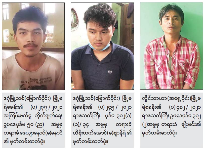 အဆိုပါပြစ်ဒဏ်ချမှတ်ခံရသူများအနက်မှ ထွက်ပြေးလွတ်မြောက်နေသူများ အား ၎င်းနှင့်စပ်လျဉ်း၍ ရာဇဝတ်ကျင့်ထုံးဥပဒေ ပုဒ်မ-၈၇၊ ၈၈ အရ ဖမ်းဝရမ်း ထုတ်ဆင့်ရန် အမိန့်ချမှတ်ခဲ့ကြောင်း သိရှိရသည်။ စစ်အုပ်ချုပ်ရေးအမိန့် ထုတ်ပြန်ကြေညာထားသည့် မြို့နယ်များအတွင်း စစ်ခုံရုံးဖြင့် စစ်ဆေးမည့်ပြစ်မှုဆိုင်ရာ ၂၃ မျိုးကိုလည်း ပူးတွဲထုတ်ပြန်ထား ကြောင်းနှင့် အဆိုပါပြစ်မှုများကို ဖောက်ဖျက်ကျူးလွန်ပါက စစ်ခုံရုံးဖွဲ့၍ စစ်ဆေးမှု များဆောင်ရွက်ကာ ထိထိရောက်ရောက် မြန်မြန်ဆန်ဆန်အရေးယူ ဆောင်ရွက် လျက်ရှိကြောင်း သတင်းရရှိသည်။
