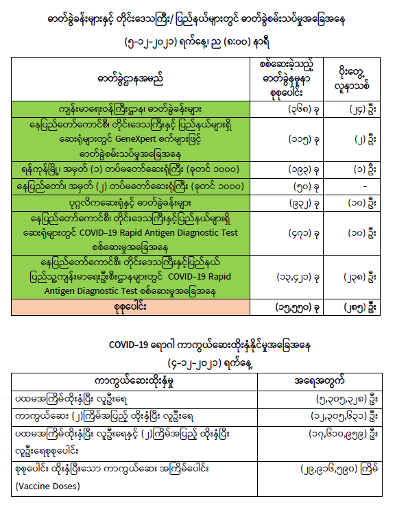 COVID-19 ရောဂါ ကာကွယ် ထိန်းချုပ်ရေးအတွက် တိုင်းဒေသကြီး/ပြည်နယ်များတွင် COVID-19 ရောဂါကာကွယ်ဆေးကို ဦးတည်အုပ်စုများသတ်မှတ်၍ ထိုးနှံပေးလျက်ရှိရာ (၄-၁၂-၂၀၂၁) ရက်နေ့အထိ လူဦးရေ စုစုပေါင်း (၁၇,၆၁၀,၉၅၉) ဦးအား ထိုးနှံပေးပြီးဖြစ်၍ ကာကွယ်ဆေးနှစ် ကြိမ် အပြည့်ထိုးနှံပြီးစီးသူ (၁၂,၃၀၅,၆၃၁) ဦး နှင့် ပထမအကြိမ်ထိုးနှံပြီးစီးသူ (၅,၃၀၅,၃၂၈) ဦး ရှိပြီဖြစ် ပါသည်။ သို့ဖြစ်ပါ၍ (၄-၁၂-၂၀၂၁) ရက်နေ့အထိ မြန်မာနိုင်ငံတွင် COVID-19 ရောဂါ ကာကွယ်ဆေး အကြိမ်ရေ စုစုပေါင်း (၂၉,၉၁၆,၅၉၀) ကြိမ် ထိုးနှံပြီး ဖြစ်ပါသည်။