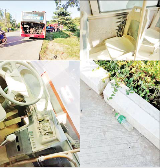 ထိုသို့ အကြမ်းဖက်မီးရှို့ဖျက်ဆီးမှုကြောင့် မော်တော်ယာဉ်တွင် ယာဉ်မောင်းအနီး ဒတ်ဘုတ် အနည်းငယ်၊ ယာဉ်၏အလယ်ရှိ ထိုင်ခုံဘေးဆိုပြား ၁ ပေခန့်၊ ယာဉ်နောက် ထိုင်ခုံအရှည်အနီး ကာရံ ထားသည့် ဆိုပြား ၁ ပေခန့်နှင့် ခရီးသည်ဆင်းသည့် အပေါက်အနီး ပလပ်စတစ်ထိုင်ခုံ ၆ လက်မခန့် အနည်းငယ် မီးလောင်ပျက်ဆီးခဲ့ကြောင်းပြီး အခင်းဖြစ်နေရာအနီးမှ THAI ARMS 380 ကျည်ခွံ ၁ ခု နှင့် ရေသန့်ဗူးခွံ ၁ ခု တွေ့ရှိသိမ်းဆည်းရမိခဲ့ကြောင်း သိရသည်။