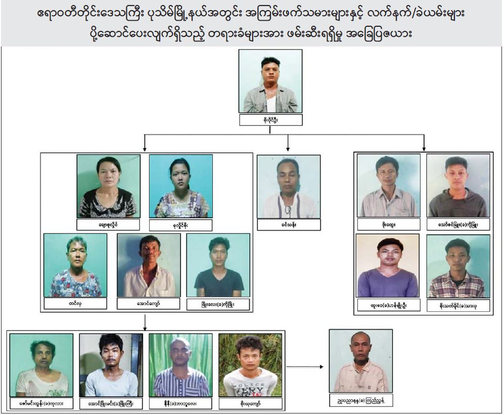 ဖြစ်စဉ်တွင် တရားခံ ကျား ၁၄ ဦး၊ မ ၂ ဦး၊ ပေါင်း ၁၆ ဦးတို့အား လက်နက်မျိုးစုံ ၄ လက်၊ ကျည်အိမ်မျိုးစုံ ၈ ခု၊ ကျည်မျိုးစုံ ၂၀၃ တောင့်၊ ရှေ့ထွက်မိုင်း ၃ လုံး၊ ဒီတိုနေတာ ၅၅ ချောင်း၊ ယမ်းထုပ် ၅ ထုပ်၊ လက်လုပ်သေနတ်ပြုလုပ်ရန် ဆင်ထားသည့် ပိုက် ၃ ခု၊ Laptop ၁ လုံး၊ သံလိုက်အိမ်မြှောင် ၂ ခု၊ ဖောက်ခွဲရေး ဆက်စပ်ပစ္စည်းများနှင့်အတူ ဖမ်းဆီးရမိခဲ့သည်။