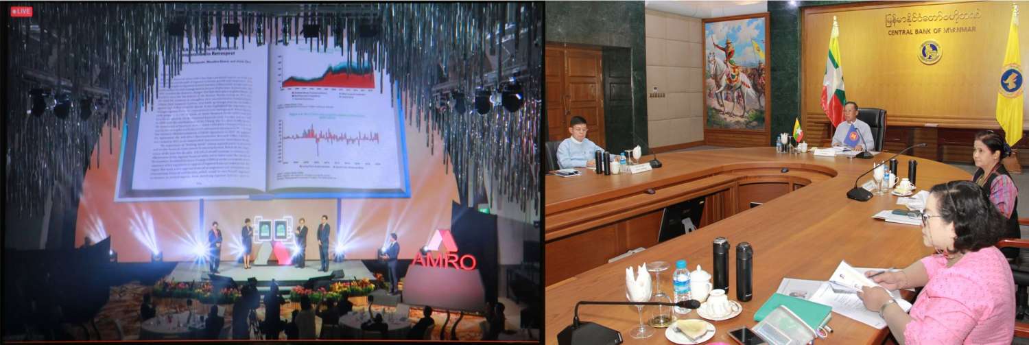 အာဆီယံ+၃ မေခရိုစီးပွားရေးသုတေသနရုံး (ASEAN +3 Macroeconomic Research Office-AMRO) မှ ကြီးမှူးကျင်းပသည့် အာဆီယံ+၃ မေခရို စီးပွားရေး သုတေသနရုံး တည်ထောင်ခြင်း (၁၀) နှစ်ပြည့် နှစ်ပတ်လည်အခမ်းအနား (AMRO’s 10th Anniversary Celebration Event) ကို ယနေ့မွန်းလွဲပိုင်းတွင် ဗီဒီယိုကွန်ဖရင့်စနစ်ဖြင့် ကျင်းပရာ မြန်မာနိုင်ငံတော်ဗဟိုဘဏ်ဥက္ကဋ္ဌ ဦးသန်းညိန်း၊ ဒုတိယဥက္ကဋ္ဌများဖြစ်ကြသော ဦးဝင်းသော်၊ ဒေါ်သန်းသန်းဆွေနှင့် မြန်မာနိုင်ငံ တော်ဗဟိုဘဏ်မှ တာဝန်ရှိသူများ တက်ရောက်ကြသည်။