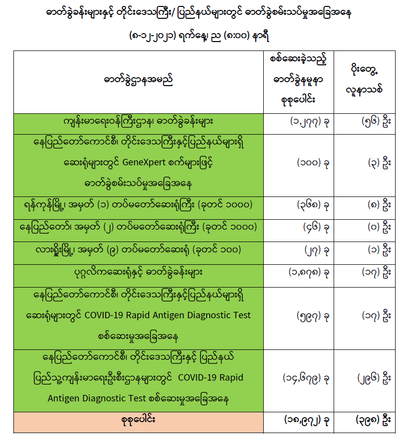 သို့ဖြစ်ပါ၍ ယနေ့အထိ ဓာတ်ခွဲနမူနာစုစုပေါင်း (၅,၇၃၄,၈၉၉) ခုအား စစ်ဆေးခဲ့ပြီး COVID-19 ဓာတ်ခွဲအတည်ပြုလူနာ စုစုပေါင်း (၅၂၅,၄၀၃) ဦး ရှိပြီဖြစ်ပါသည်။