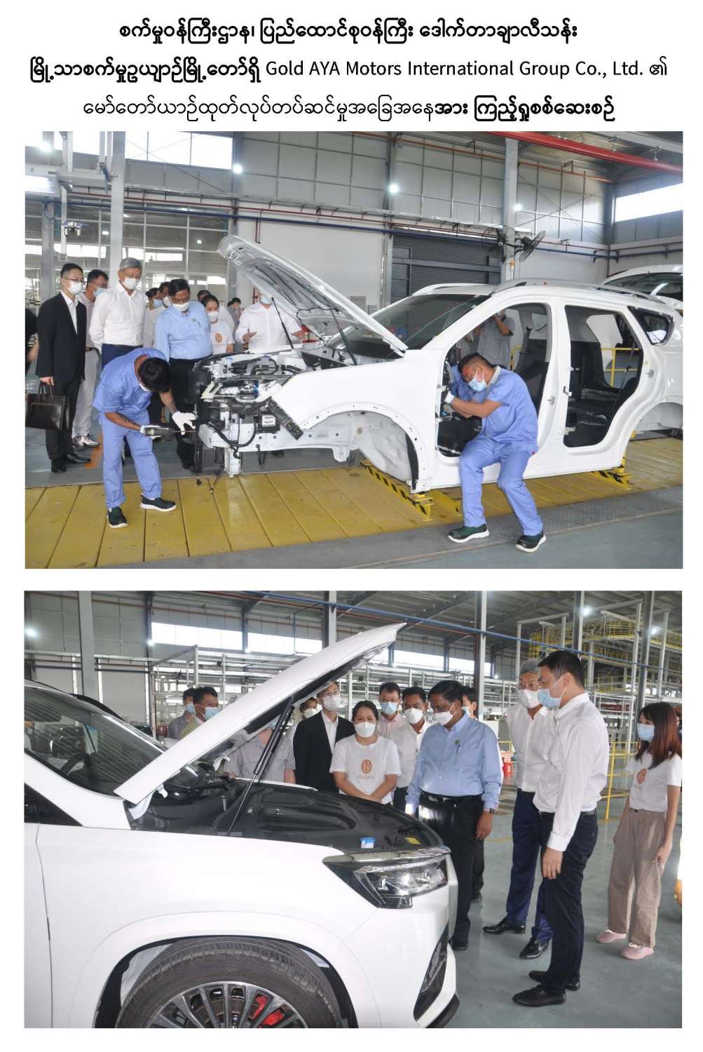 မွန်းလွဲပိုင်းတွင် ပြည်ထောင်စုဝန်ကြီးသည် တံတားဦးမြို့နယ်၊ မြို့သာစက်မှု ဥယျာဉ်မြို့တော်သို့ ရောက်ရှိပြီး စက်မှုဇုန်တာဝန်ရှိသူများက စက်မှုဇုန်တည်ဆောက် အကောင်အထည်ဖော် ဆောင်ရွက် ခဲ့မှုအခြေအနေနှင့် ဆက်လက်ဆောင်ရွက် သွားမည့် အစီအမံတို့ကို ရှင်းလင်းတင်ပြရာ ပြည်ထောင်စုဝန်ကြီးက လိုအပ်သည်များ ဖြည့်စွက် ပြောကြားပြီး Gold AYA Motors International Group Co., Ltd. ၏ SKD စနစ်ဖြင့် မော်တော်ယာဉ်များ တပ်ဆင်ထုတ်လုပ်နေမှုကို လှည့်လည်ကြည့်ရှု စစ်ဆေးသည်။
