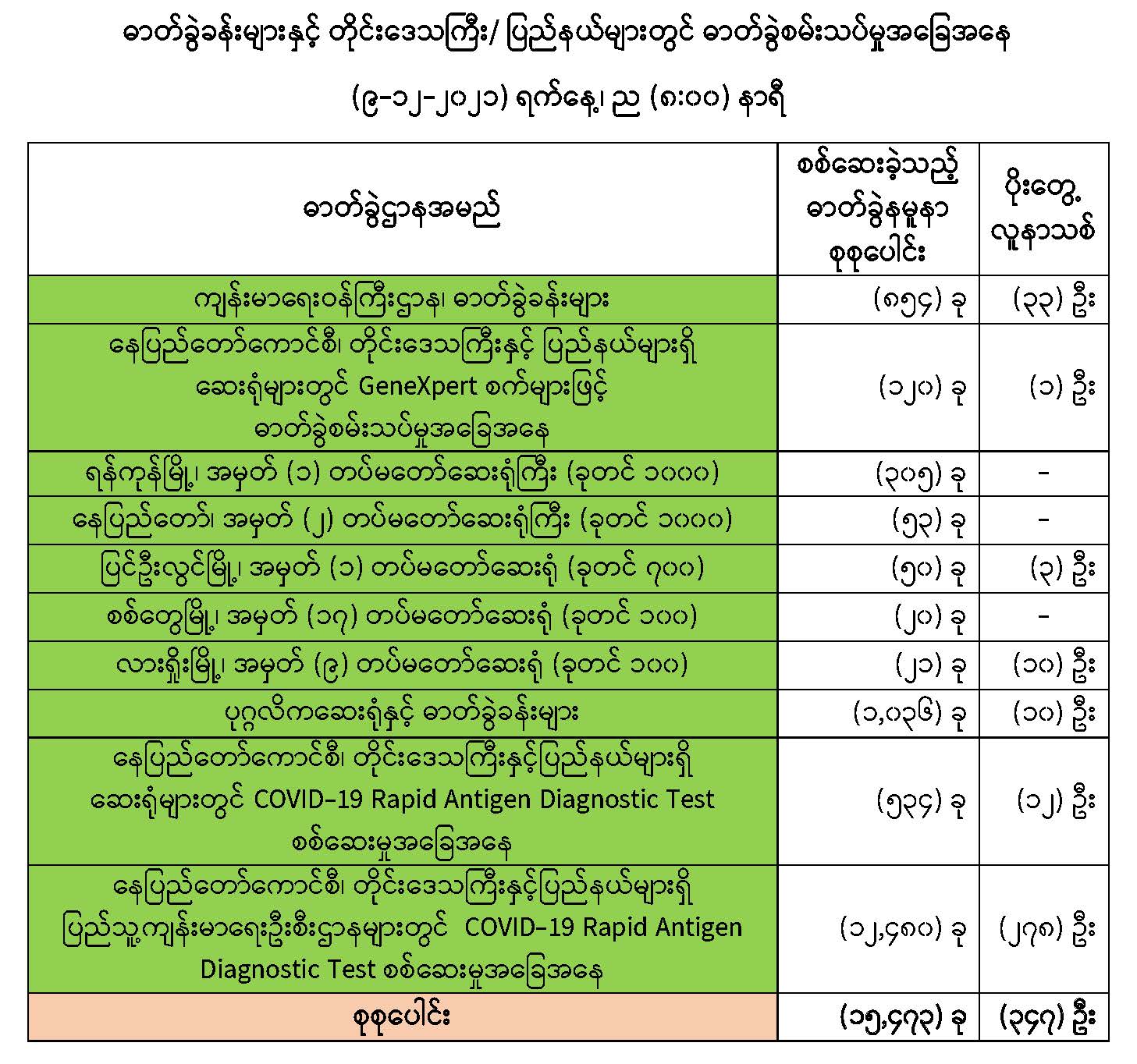 သို့ဖြစ်ပါ၍ ယနေ့အထိ ဓာတ်ခွဲနမူနာစုစုပေါင်း (၅,၇၅၀,၃၇၂) ခုအား စစ်ဆေးခဲ့ပြီး COVID-19 ဓာတ်ခွဲအတည်ပြုလူနာ စုစုပေါင်း (၅၂၅,၇၅၀) ဦး ရှိပြီ ဖြစ်ပါသည်။