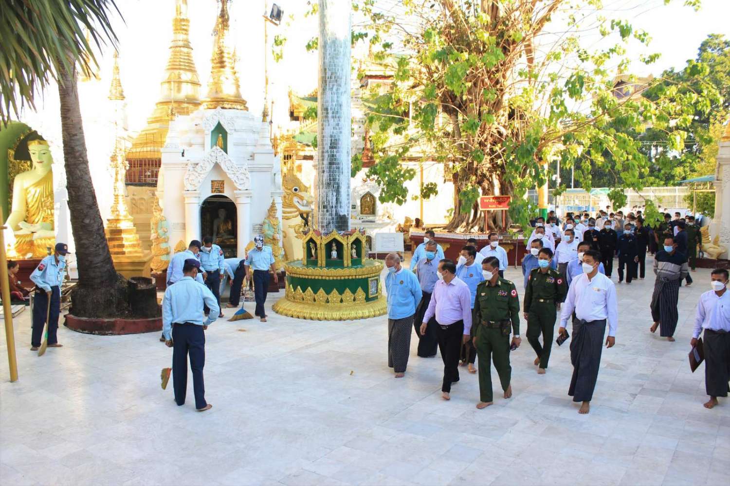 ရန်ကုန်တိုင်းဒေသကြီး ဒဂုံမြို့နယ်အတွင်းရှိ တိင်္ဂုတ္တရကုန်းတော်ပေါ်၌ တည်ထားကိုးကွယ်တော်မူသော လေးဆူဓာတ်ပုံ ရွှေတိဂုံစေတီတော်မြတ်ကြီး ရေရှည်တည်တံ့ ခိုင်မြဲစေရေး ထိန်းသိမ်းဆောင်ရွက်နေမှုနှင့် ရင်ပြင်တော် သန့်ရှင်းသာယာလှပစေရေး စုပေါင်းသန့်ရှင်းရေး ဆောင်ရွက်နေမှုကို ယနေ့နံနက် ၇ နာရီက ရန်ကုန်တိုင်းဒေသကြီး ဝန်ကြီးချုပ် ဦးလှစိုး၊ တိုင်းမှူး ဗိုလ်ချုပ် ညွှန့်ဝင်းဆွေ နှင့် အစိုးရအဖွဲ့ဝန်ကြီးများ က ကြည့်ရှုအားပေးခဲ့ကြောင်း သိရသည်။