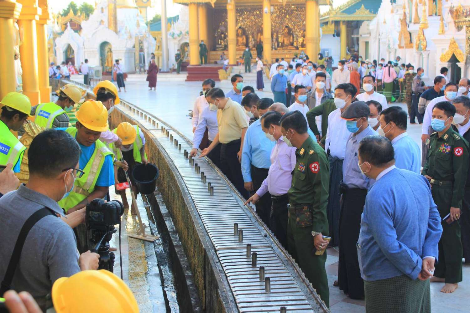 ရှေးဦးစွာ ဝန်ကြီးချုပ် ဦးလှစိုးနှင့် တာဝန်ရှိသူများသည် စေတီတော်မြတ်ကြီး ရင်ပြင်တော်၌ အထွေထွေ အုပ်ချုပ်ရေးဦးစီးဌာန၊ မီးသတ်ဦးစီးဌာန၊ စည်ပင်သာယာဝန်ထမ်းများ၊ ဌာနဆိုင်ရာများမှ ဝန်ထမ်းများ၊ မြန်မာနိုင်ငံ ကြက်ခြေနီအသင်းမှ ကြက်ခြေနီသူနာပြုတပ်ဖွဲ့ဝင်များ၊ တပ်မတော်သားများက ရင်ပြင်တော်တစ်လျှောက် တံမြက်စည်းလှည်းခြင်း၊ ဆီးမီးပူဇော် စုပေါင်းသန့်ရှင်းရေးပြုလုပ်၍ ကုသိုလ်ယူ ဆောင်ရွက်နေမှုကို လိုက်လံကြည့်ရှု့ အားပေးခဲ့ကြပြီး၊ ရင်ပြင်တော် တစ်ပတ် လိုက်လံကြည့်ရှု ကြည်ညိုခဲ့ရာ စေတီတော်မြတ်ကြီး ရေရှည်တည်တံ့ ခိုင်မြဲရေးအတွက် ထိန်းသိမ်းဆောင်ရွက်နေမှု၊ စေတီတော်ရင်ပြင် သန့်ရှင်းသာယာလှပစေရေးနှင့် ဘုရားဖူး လာပြည်သူများ အေးအေးချမ်းချမ်း လာရောက်ဖူးမြှော်ကြည်ညိုနိုင်ရေးအတွက် ဆောင်ရွက်နေမှုများအား ရွှေတိဂုံစေတီတော် ဘဏ္ဍာတော်ထိန်း ဂေါပကအဖွဲ့ဝင်များက ရှင်းလင်းတင်ပြခဲ့ကြောင်း သိရသည်။