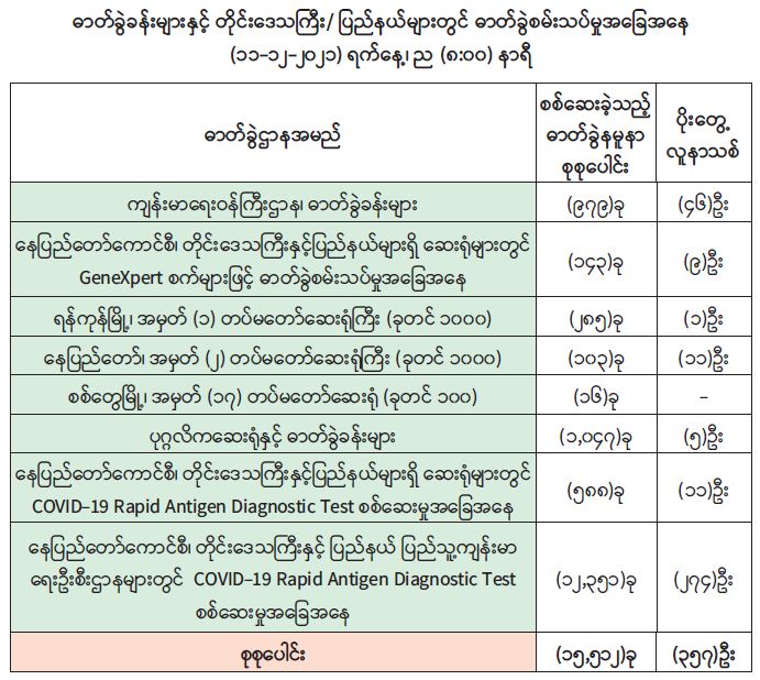 ကျန်းမာရေးဝန်ကြီးဌာနအနေဖြင့် နိုင်ငံအတွင်း ကူးစက်ဖြစ်ပွားနေသော ကိုဗစ်-၁၉ ရောဂါ ကာကွယ်၊ ကုသ၊ ထိန်းချုပ်ရေးလုပ်ငန်းများကို အရှိန်အဟုန်မြှင့် ဆောင်ရွက်လျက်ရှိပါသည်။
