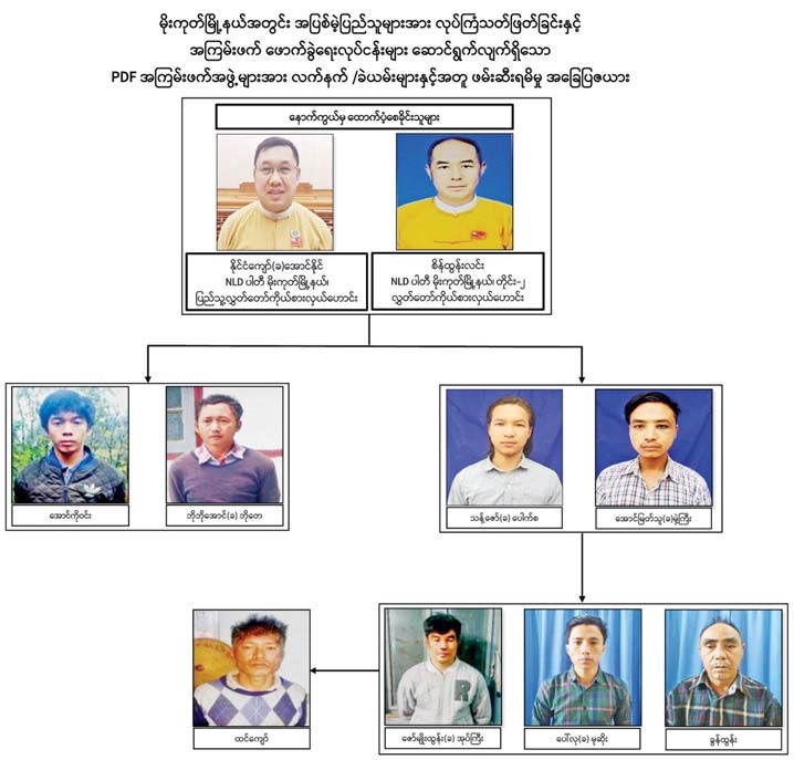 မိုးကုတ်မြို့နယ်အတွင်း PDF အကြမ်းဖက်အဖွဲ့များမှ ဖောက်ခွဲရေးလုပ်ငန်း ဆောင်ရွက်မှု လေးကြိမ်၊ အပြစ်မဲ့ပြည်သူများအားလုပ်ကြံ သတ်ဖြတ်မှု ကိုးကြိမ် ကျူးလွန်ခဲ့ပြီး နိုင်ငံ့ဝန်ထမ်းများနှင့် အပြစ်မဲ့ပြည်သူ ၁၄ ဦးအားသတ်ဖြတ်ခဲ့ကြောင်း၊ ထိုသို့ အကြမ်းဖက် ဖောက်ခွဲမှုနှင့် လုပ်ကြံသတ်ဖြတ်မှုများအား ဖမ်းဆီးရန်ကျန် နိုင်ငံကျော်(ခ)အောင်နိုင် (NLD ပါတီမိုးကုတ် မြို့နယ်၊ ပြည်သူ့လွှတ်တော်ကိုယ်စားလှယ်ဟောင်း) နှင့် စိန်ထွန်းလင်း (NLD ပါတီ မိုးကုတ်မြို့နယ်၊ တိုင်း-၂ လွှတ်တော်ကိုယ်စားလှယ်ဟောင်း) တို့မှ နောက်ကွယ်မှ ထောက်ပံ့၍ စေခိုင်းနေခြင်း ဖြစ်ကြောင်း ဖော်ထုတ်သိရှိရသည်။