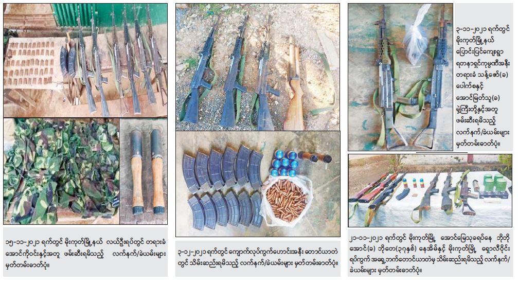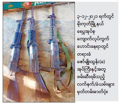 နိုင်ငံတော်အစိုးရအနေဖြင့် CRPH၊ NUG နှင့် PDF အကြမ်းဖက်အဖွဲ့များမှ ပြည်သူလူထု အထိတ်အလန့်ဖြစ်စေရန်အတွက် ဖောက်ခွဲဖျက်ဆီး ခြင်းနှင့် အပြစ်မဲ့ပြည်သူများအား လုပ်ကြံသတ်ဖြတ်ခြင်းစသည့် အကြမ်းဖက်လုပ်ရပ်များအား ဆောင်ရွက်နိုင်မှုမရှိစေရေး ဖော်ထုတ် ဖမ်းဆီးခြင်းများအား နေ့/ညမပြတ်ဆောင်ရွက်လျက်ရှိရာ အေးချမ်းစွာ နေထိုင်လိုသည့် တာဝန်သိပြည်သူများ၏ သတင်းပေးချက်အရ နိုဝင်ဘာလ ၁၅ ရက်တွင် မိုးကုတ်မြို့၊ လယ်ဦးရပ်ရှိ မိညောင်(ခ)ညီညီအောင်၏ နေအိမ်တွင်မိုးကုတ် PDF အကြမ်းဖက် အဖွဲ့ဝင်များ ရောက်ရှိနေကြောင်းသိရှိရသဖြင့် လုံခြုံရေးပူးပေါင်းအဖွဲ့မှ ဝင်ရောက်ရှာဖွေခဲ့ရာ တရားခံ အောင်ကိုဝင်း (၂၀)နှစ်အား KA-25 သေနတ် ခြောက်လက်၊ ကျည်အိမ် ခုနစ်ခု၊ ကျည် ၂၅၀ တောင့်၊ ကြိုးဆွဲလက်ပစ်ဗုံး နှစ်လုံး၊ အီကွေ့မန့် ခြောက်စုံတို့နှင့်အတူ ဖမ်းဆီးရမိခဲ့ပြီး တရားခံ အောင်ကိုဝင်း၏ ထွက်ဆိုချက်အရ မိုးကုတ်မြို့၊ လယ်ဦးကျေးရွာ၊ သံလွင်တောင်ရပ်ရှိ တောင်ယာတဲ၌ KA-25 သေနတ် နှစ်လက်အား ထပ်မံသိမ်းဆည်းရမိခဲ့သည်။