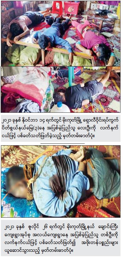 ပတ္တမြားမြေ PDF အကြမ်းဖက်အဖွဲ့မှ ဇူလိုင်လ ၂၆ ရက်တွင် မိုးကုတ်မြို့၊ ချောင်းကြီးကျေးရွာ အုပ်စု၊ အလယ်ကျေးရွာနေအပြစ်မဲ့ပြည်သူ တစ်ဦးအား ဇော်မျိုးထွန်း(ခ)အုပ်ကြီး ဖမ်းဆီးရန် ကျန် ဗလကြီး၊ မောင်ရှိုင်း၊ ထက်ရှိုင်း၊ ချိုငယ်၊ တက်တူး(ခ)သက်ဇော်ဟိန်းနှင့် မျိုးလင်းကိုတို့ ခုနစ်ဦးမှ သတ်ဖြတ်၍ နေအိမ်ရှိ အဖိုးတန်ပစ္စည်းများအား ယူဆောင်သွားခဲ့ကြောင်း။