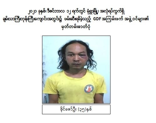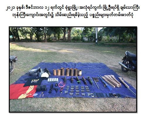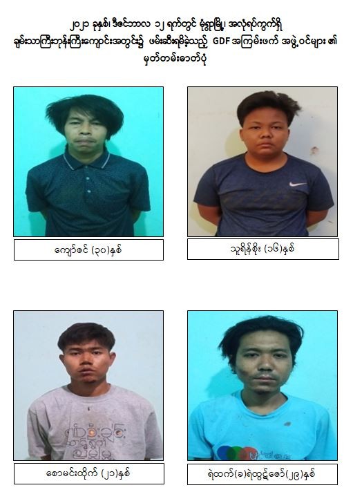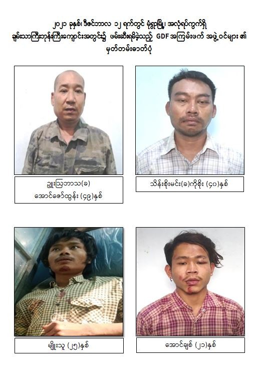 ထိုသို့ အကြမ်းဖက်လုပ်ငန်းများ လုပ်ဆောင်နိုင်မှုမရှိစေရေး လုံခြုံရေးတပ်ဖွဲ့ ဝင်များကလိုအပ်သည့် စုံစမ်းရှာဖွေဖော်ထုတ်မှုများကို ဆောင်ရွက်လျက်ရှိရာ ဒီဇင်ဘာလ ၁၂ ရက်တွင် မုံရွာမြို့၊ အလုံရပ်ကွက်၊ မြို့ဦးရပ်ရှိ ချမ်းသာကြီးဘုန်းကြီးကျောင်းအတွင်း၌ GDF အမည်ခံအကြမ်းဖက်သူများ ရောက်ရှ ိနေကြောင်း သိရှိရသဖြင့် လုံခြုံရေးပူးပေါင်းအဖွဲ့မှ သွားရောက်စစ်ဆေးရှာဖွေခဲ့ရာ ကျောင်းတိုက် အတွင်း၌ ဩဘာသ(ခ)အောင်ဇော်ထွန်း (၄၉)နှစ်၊ သိန်းစိုးမင်း (ခ)ကိုစိုး(၄၀)နှစ်၊ မျိုးသူ(၂၅)နှစ်၊ အောင်ချစ်(၂၁)နှစ်၊ ကျော်ဇင်(၃၀)နှစ်၊ သူရိန်စိုး(၁၆) နှစ်၊ စောမင်းထိုက်(၂၁)နှစ်၊ ရဲထက်(ခ) ရဲထွဋ်ဇော်(၂၉)နှစ်နှင့် ခိုင်ဇော်ဦး (၃၅)နှစ်၊ ပေါင်း ၉ ဦးတို့အား လက်လုပ်သေနတ် ၁ လက်၊ လက်လုပ်လေသေနတ် ၅ လက်၊ လက်လုပ်သေနတ်တို ၁ လက်၊ ပြုလုပ်ဆဲလက်လုပ်သေနတ် ၇လက်၊ လက်လုပ်ကျည်ခွံ ၉၆ ခု၊ ပြုလုပ်ဆဲလက်လုပ်ဗုံး ၇ လုံး၊ ၇.၆၂ ကျည် ၃ တောင့်၊ ပွိုင့်-၂၂ ကျည် ၂၀ တောင့်၊ ဖောက်ခွဲရေးဆက်စပ်ပစ္စည်းများနှင့်အတူ ဖမ်းဆီးရမိခဲ့သည်။