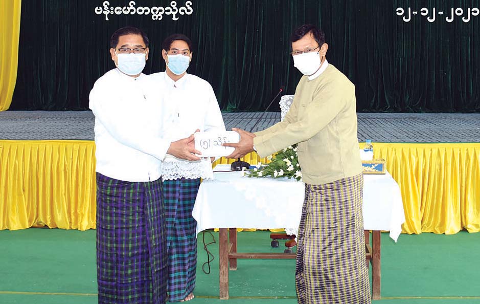 ထို့နောက် ဗန်းမော်တက္ကသိုလ်၊ နည်းပညာ တက္ကသိုလ်၊ ကွန်ပျူတာတက္ကသိုလ်တို့မှ ပါမောက္ခ ချုပ်၊ ဒုတိယပါမောက္ခချုပ်များနှင့် အစိုးရနည်းပညာ အထက်တန်းကျောင်းမှ ကျောင်းအုပ်ကြီးတို့က ကျောင်းဆိုင်ရာအချက်အလက်များနှင့်လိုအပ်ချက် များကို တင်ပြကြပြီး ပြည်နယ်ဝန်ကြီးချုပ်နှင့် ပြည်နယ်ဝန်ကြီးတို့က တက္ကသိုလ်များနှင့် အစိုးရ နည်းပညာအထက်တန်းကျောင်းတို့အတွက် ထောက်ပံ့ ငွေကျပ်ငါးသိန်းစီဖြင့် စုစုပေါင်း ထောက်ပံ့ငွေကျပ် သိန်း ၂၀ ကို ပေးအပ်ပြီး (အပေါ်ပုံ) တက္ကသိုလ်များ၏ လိုအပ်ချက်များအပေါ် ဖြေရှင်းဆောင်ရွက်ပေးကာ တက္ကသိုလ်ဝင်းအတွင်း တည်ဆောက်လျက်ရှိသော စာကြည့်တိုက်၊ စာသင်ဆောင်နှင့် ဘောလုံးကွင်း ပွဲကြည့်စင် တည်ဆောက်ရေးလုပ်ငန်း ဆောင်ရွက်မှု အခြေအနေများနှင့်တက္ကသိုလ်ဝင်းအတွင်း လှည့်လည် ကြည့်ရှုစစ်ဆေးသည်။