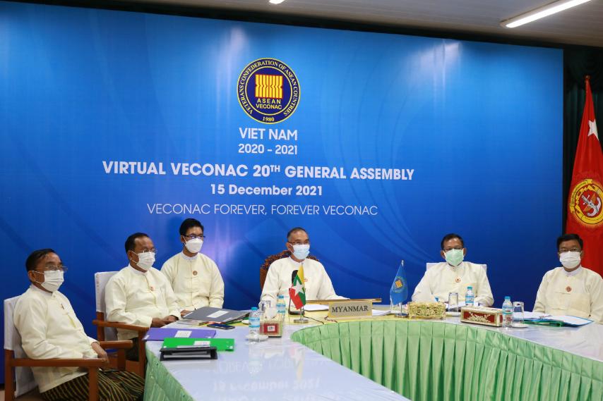 အာဆီယံနိုင်ငံများ စစ်မှုထမ်းဟောင်းအဖွဲ့၏ (၃၃)ကြိမ်မြောက်အလုပ်အမှုဆောင် အဖွဲ့အစည်းအဝေးနှင့်အကြိမ် (၂၀)မြောက် အထွေထွေညီလာခံတို့ကို ယနေ့ နံနက်ပိုင်းတွင် ဗီယက်နမ်နိုင်ငံ စစ်မှုထမ်း ဟောင်းအဖွဲ့မှ ဦးစီး၍ ဗီဒီယိုကွန်ဖရင့်စနစ်ဖြင့် ကျင်းပရာ အဖွဲ့ဝင် နိုင်ငံ ၁၀ နိုင်ငံမှ ဥက္ကဋ္ဌများ၊ ဒုတိယဥက္ကဋ္ဌများနှင့် ကိုယ်စားလှယ်အဖွဲ့များ တက်ရောက်ခဲ့ပြီး မြန်မာနိုင်ငံ စစ်မှုထမ်းဟောင်းအဖွဲ့ မှ ဗဟိုအမှုဆောင်အဖွဲ့ ဥက္ကဋ္ဌ ဒုတိယ ဗိုလ်ချုပ်ကြီး စိန်ဝင်း (ငြိမ်း) ဦးဆောင်သော မြန်မာကိုယ်စားလှယ်အဖွဲ့ ၄ ဦး တက်ရောက်ကြသည်။