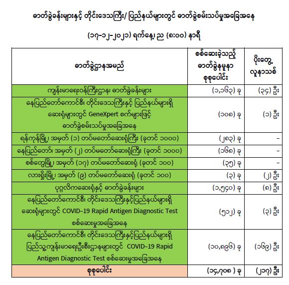 သို့ဖြစ်ပါ၍ ယနေ့အထိ ဓာတ်ခွဲနမူနာစုစုပေါင်း (၅,၈၇၂,၇၀၇) ခုအား စစ်ဆေးခဲ့ပြီး COVID-19 ဓာတ်ခွဲအတည်ပြုလူနာ စုစုပေါင်း (၅၂၇,၉၃၁) ဦး ရှိပြီ ဖြစ်ပါသည်။