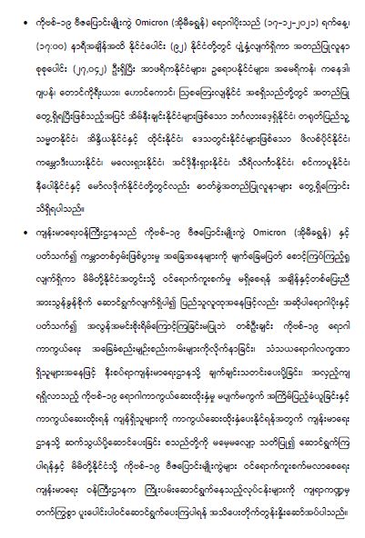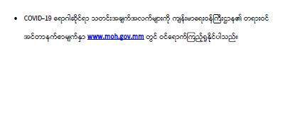 ကျန်းမာရေးဝန်ကြီးဌာနအနေဖြင့် နိုင်ငံအတွင်း ကူးစက်ဖြစ်ပွားနေသော COVID-19 ရောဂါ ကာကွယ်၊ ကုသ၊ ထိန်းချုပ်ရေးလုပ်ငန်းများကို အရှိန်အဟုန်မြှင့် ဆောင်ရွက်လျက်ရှိရာ ရောဂါ ထိန်းချုပ်ရေးလုပ်ငန်းများ အောင်မြင်နိုင်ရေးအတွက် ပြည်သူလူထုအနေဖြင့် ကျန်းမာရေး ဝန်ကြီးဌာနမှ ထုတ်ပြန်ထားသော COVID-19 ရောဂါ ကာကွယ်ထိန်းချုပ်ရေးဆိုင်ရာ စည်းကမ်း များကို စနစ်တကျ လိုက်နာဆောင်ရွက်ရန် လိုအပ်ပြီး COVID-19 ကာကွယ်ဆေးထိုးနှံမှု ခံယူခြင်းအား အထူးဂရုပြု ပူးပေါင်းဆောင်ရွက်ကြရန် လိုအပ်ပါသည်။