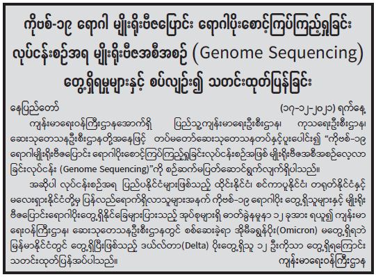 ကိုဗစ် − ၁၉ ရောဂါ မျိုးရိုးဗီဇပြောင်း ရောဂါပိုးစောင့်ကြပ်ကြည့်ရှုခြင်း လုပ်ငန်းစဉ်အရ မျိုးရိုးဗီဇအစီအစဉ် (Genome Sequencing) တွေ့ရှိမှုများနှင့် စပ်လျဉ်း၍ သတင်းထုတ်ပြန်ခြင်း 12/18/2021