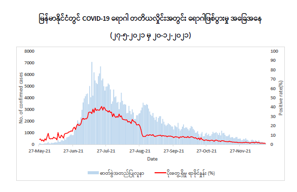 • ကျန်းမာရေးဝန်ကြီးဌာနမှ ဝန်ထမ်းများ၏ အားတက်သရော ကြိုးပမ်းဆောင်ရွက်မှု၊ ပြည်သူ လူထုမှ စနစ်တကျ စည်းကမ်းလိုက်နာမှု၊ ဌာနဆိုင်ရာအသီးသီးမှ ဟန်ချက်ညီ ပူးပေါင်း ဆောင်ရွက်မှုနှင့် လူမှုရေးအသင်းအဖွဲ့အစည်းများမှ တက်ကြွစွာ ပံ့ပိုးပူးပေါင်း ဆောင်ရွက်မှု တို့ကြောင့် ရောဂါစောင့်ကြပ်ကြည့်ရှုရေးဆိုင်ရာ ရက်သတ္တပတ်အလိုက် သုံးသပ်ချက်များအရ ဓာတ်ခွဲအတည်ပြုလူနာတွေ့ရှိရမှုနှင့် ရောဂါပိုးတွေ့ရှိမှု ရာခိုင်နှုန်းတို့မှာ တဖြည်းဖြည်း လျော့နည်း ကျဆင်းလာကြောင်း တွေ့ရှိရပါသည်။