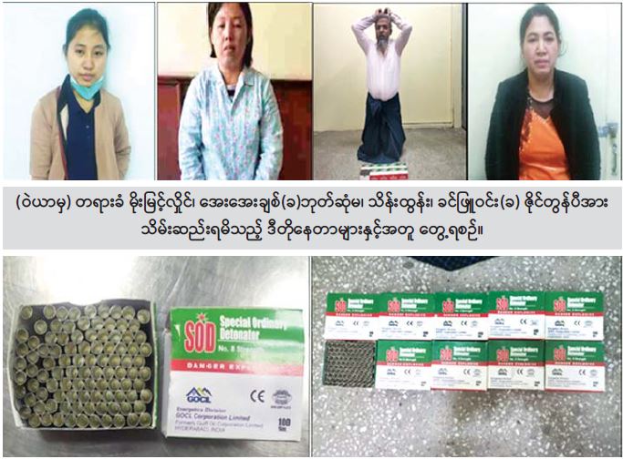 ဖြစ်စဉ်မှာ ဒီဇင်ဘာလ ၂၀ ရက် နံနက် ၈ နာရီ ၂၅ မိနစ်ခန့်တွင် မန္တလေးတိုင်းဒေသကြီး၊ တံတားဦးမြို့နယ်ရှိ မန္တလေးပြည်ပြည်ဆိုင်ရာလေဆိပ်၊ အမှတ်(၁)ထွက်ခွာ X-Ray စက်၌ တာဝန်ကျတပ်ဖွဲ့ဝင်များက ခရီးသည်များအား ရှာဖွေစစ်ဆေးမှုများ ဆောင်ရွက်နေစဉ် လေယာဉ်အမျိုးအစား ART-72၊ ခရီးစဉ်အမှတ် K7-771 ဖြင့် မန္တလေးမြို့မှ ခန္တီးမြို့သို့ လိုက်ပါမည့် ခရီးသည် စစ်ကိုင်းတိုင်းဒေသကြီး၊ ခန္တီးမြို့နယ်၊ ဆင်သေကျေးရွာနေ မမိုးမြင့်လှိုင်(၂၀)နှစ် (ဘ) ဦးဟွန်းထိုက်၏ ဂျပ်ဖာဘူးအတွင်းမှ ဖလူဇာဆေးကဒ်များဖြင့် ရောနှောသယ်ဆောင်လာသည့် (SOD- Special Ordinary Detonator) တံဆိပ်ပါဘူးအတွင်းမှ အကြမ်းဖက်ဖောက်ခွဲရေးပြုလုပ်ရာတွင် အသုံးပြုမည့် ဒီတိုနီတာ ၉၈ ခု အား တွေ့ရှိသိမ်းဆည်းရမိခဲ့ပြီး မမိုးမြင့်လှိုင်၏ ထွက်ဆိုချက်အရ အဆိုပါဒီတိုနီတာများအား သယ်ဆောင်ခိုင်းခဲ့သည့် မဟာအောင်မြေမြို့နယ်၊ ဟေမမာလာတောင် ရပ်ကွက်၊ ၃၈ လမ်းနှင့် ၃၉ လမ်းကြားရှိ အိမ်အမှတ်(၄၀)နေ မအေးအေးချစ်(ခ)ဘုတ်ဆုံ(၃၉)နှစ် (ဘ)ဦးသိန်းချစ်နှင့် သယ်ဆောင်လာသည့် ဒီနေတာများအား လွှဲပြောင်းလက်ခံပေးမည့် ဆင်သေ ကျေးရွာနေ မမိုးမြင့်လှိုင်၏မိခင်ဖြစ်သူ ဒေါ်လောဟွေ(ခ)ဒေါ်ကြောင်ဖဟွေ(ခ)ဒေါ်တင်သိန်း(၆၃)နှစ် တို့အား ၎င်းတို့၏နေအိမ်အသီးသီးတွင် ထပ်မံဖမ်းဆီးရမိခဲ့သည်။