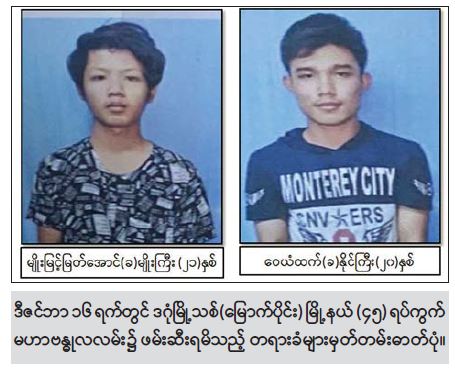 ဖမ်းဆီးရမိတရားခံ မျိုးမြင့်မြတ်အောင်(ခ)မျိုးကြီးနှင့် ဝေယံထက်(ခ)နိုင်ကြီး တို့၏ ထွက်ဆိုချက်အရ ရဲစခန်းအား ပစ်ခတ်တိုက်ခိုက်ရာတွင် ပါဝင်ခဲ့သူ မြောက်ဥက္ကလာပမြို့နယ်၊ (၆)ရပ်ကွက်၊ ပိတောက်လမ်း၊ အမှတ်(၄၁)နေ ဆက်စပ်တရားခံ မိုးကျော်သူ(ခ)အာကြီး (ခ) Rock Gyi (၂၆) နှစ်နှင့် အဆိုပါရပ်ကွက်၊ ခရေလမ်း၊ အမှတ်(၁၂၉)နေ ကျော်မိုးလွင်(ခ) ကျော်ကြီး (၂၆)နှစ်တို့နှစ်ဦးအား ပိတောက်လမ်းပေါ်၌ ထပ်မံဖမ်းဆီးရမိခဲ့သည်။