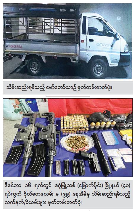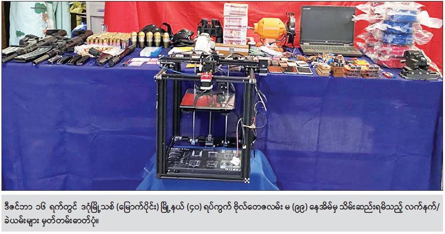 ဖြစ်စဉ်တွင် ဖမ်းဆီးရမိတရားခံ ကျားငါးဦး၊ မတစ်ဦး၊ ပေါင်းခြောက်ဦးတို့အား MK-12 သေနတ် နှစ်လက်၊ ၎င်းကျည် ၁၁၀ တောင့်၊ SIG SAUER ပစ္စတိုတစ်လက်၊ 9MM LUGER ကျည် ၂၅၅ တောင့်၊ ၄၀ မမ ဗုံးသီးငါးလုံး၊ ကျည်အိမ်မျိုးစုံခြောက်ခု၊ ဒူးကာသုံးစုံ၊ ဖောက်ခွဲရေးတွင် တွဲဖက် အသုံးပြုသည့် Keypad ဖုန်းမျိုးစုံ ၂၀ လုံးနှင့် ဆက်စပ်ပစ္စည်းများ၊ ဆားကစ်(စ်)ပြား ၅၀ ခု၊ 3D GUN Printer တစ်လုံးနှင့် 3D GUN Printer ဆေးကြိုးခွေ ၁၀ ခွေ၊ Laptop ၁ လုံး၊ မှန်ပြောင်း တစ်လက်၊ မော်တာတစ်လုံး၊ ငွေသိန်း ၁၀၀ ကျပ်၊ ဓာတ်ငွေ့ကာတစ်ခု၊ မော်တော်ယာဉ် တစ်စီးတို့နှင့်အတူ ဖမ်းဆီးရမိခဲ့သည်။