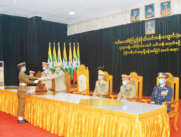ယနေ့ကျင်းပပြုလုပ်သည့် ပြန်တမ်းဝင်အရာရှိခန့်အပ်ခြင်း အခမ်းအနားတွင် ကျောင်းဆင်းဘွဲ့ရ အမျိုးသမီးဗိုလ်လောင်းများအား ဒုတိယဗိုလ်အဆင့်ဖြင့် ရာထူးခန့်အပ်ပေးခြင်းဖြစ်သည်။ ဘွဲ့ရ အမျိုးသမီးအရာရှိဗိုလ်လောင်းသင်တန်းအား တပ်မတော်အတွက် အရည်အချင်းပြည့်ဝသည့် ဦးစီးအရာရှိများ မွေးထုတ်ပေးရန်ဆိုသည့် ရည်ရွယ်ချက်ဖြင့် တပ်မတော်(ကြည်း) ဗိုလ်သင်တန်း ကျောင်း (မှော်ဘီ)၌ ၂၀၁၄ ခုနှစ်မှ စတင်ဖွင့်လှစ်သင်ကြားခဲ့ပြီး ယခုအခါဘွဲ့ရ အမျိုးသမီး ဗိုလ်လောင်းအမှတ်စဉ်(၈)အထိ လေ့ကျင့်မွေးထုတ်ပေးနိုင်ခဲ့ပြီဖြစ်ကြောင်းနှင့် သင်တန်းဆင်း အမျိုးသမီးအရာရှိများအနေဖြင့် သက်ဆိုင်ရာ (ကြည်း၊ ရေ၊ လေ) လက်ရုံးတပ်ဖွဲ့များတွင် အသီးသီး တာဝန်ထမ်းဆောင်ကြရမည်ဖြစ်ကြောင်း သတင်းရရှိသည်။