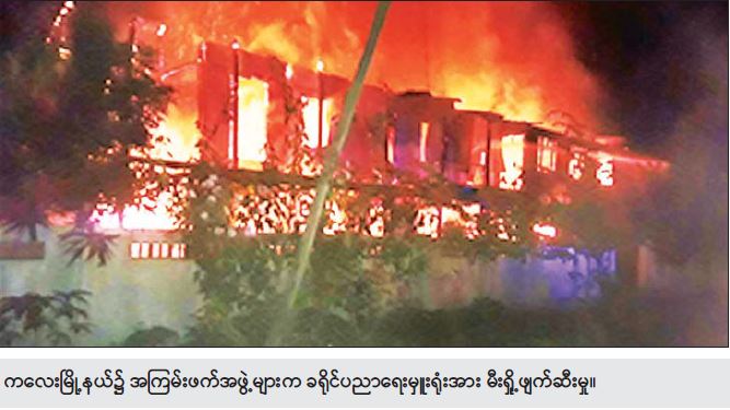 အလားတူ ည ၇ နာရီ ၂၀ မိနစ်အချိန်တွင် ကလေးမြို့နယ်၊ စမ်းမြို့ရပ်ကွက်၊ မြို့ပတ်လမ်းရှိ ကလေးခရိုင် ပညာရေးမှူးရုံးအား အကြမ်းဖက်သမားများက မီးရှို့ဖျက်ဆီးသွားကြောင်း သတင်း ရရှိသဖြင့် လုံခြုံရေးတပ်ဖွဲ့ဝင်များနှင့် မီးသတ်တပ်ဖွဲ့ဝင်များ ပါဝင်သော ပူးပေါင်းအဖွဲ့က မီးသတ်ယာဉ် ၅ စီး၊ ရေသယ်ယာဉ် ၂ စီးတို့ဖြင့် သွားရောက်မီးငြှိမ်းသတ်ခဲ့ရာ ၃၅ မိနစ်အကြာတွင် မီးငြိမ်း သွားခဲ့ပြီး မီးလောင်မှုကြောင့် အလျား ၈၀ ပေ၊ အနံ ၂၀ ပေ၊ အမြင့် ၂၈ ပေရှိ ကွန်ကရစ်ခင်း၊ အုတ်ကာ/သွပ်မိုး/နံကပ်တိုက် အဆောက်အဦ ၁ လုံး မီးလောင်ပျက်စီးခဲ့ကြောင်း သိရှိရသည်။