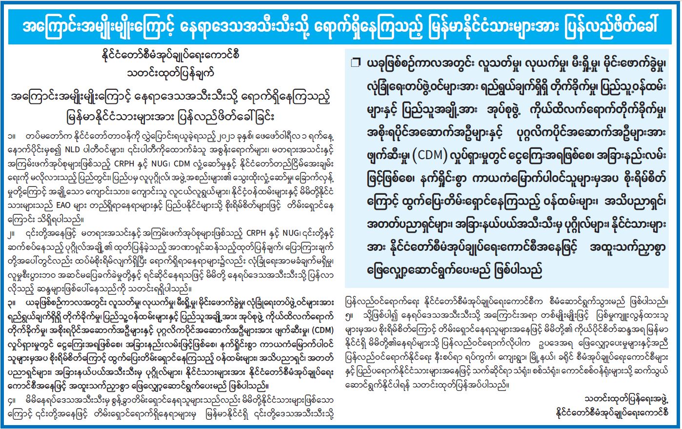 အကြောင်းအမျိုးမျိုးကြောင့် နေရာဒေသအသီးသီးသို့ ရောက်ရှိနေကြသည့် မြန်မာနိုင်ငံသားများအား ပြန်လည်ဖိတ်ခေါ် 12/27/2021