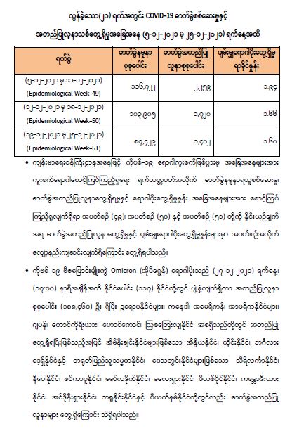 ကျန်းမာရေးဝန်ကြီးဌာနအနေဖြင့် နိုင်ငံအတွင်း ကူးစက်ဖြစ်ပွားနေသော COVID-19 ရောဂါ ကာကွယ်၊ ကုသ၊ ထိန်းချုပ်ရေး လုပ်ငန်းများကို အရှိန်အဟုန်မြှင့် ဆောင်ရွက်လျက်ရှိပါသည်။