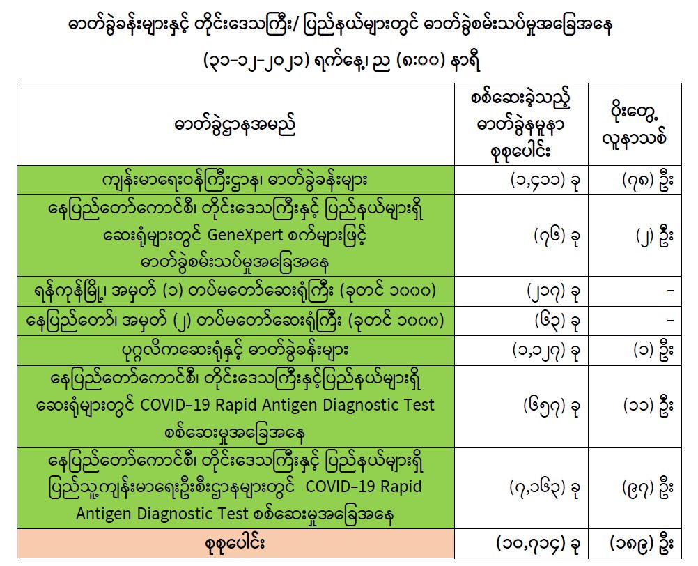 သို့ဖြစ်ပါ၍ ယနေ့အထိ ဓာတ်ခွဲနမူနာစုစုပေါင်း (၆,၀၄၀,၆၅၀) ခုအား စစ်ဆေးခဲ့ပြီး COVID-19 ဓာတ်ခွဲအတည်ပြုလူနာ စုစုပေါင်း (၅၃၀,၈၃၄) ဦး ရှိပြီ ဖြစ်ပါသည်။