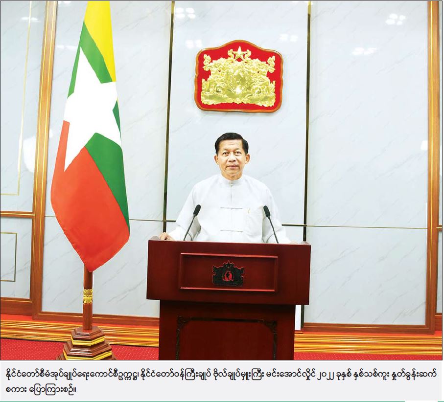 တပ်မတော်အနေနဲ့ ဖွဲ့စည်းပုံအခြေခံဥပဒေက ပေးအပ်ထားတဲ့ တာဝန်ဝတ္တရားများနဲ့အညီ နိုင်ငံတော်ရဲ့အကျိုး၊ တိုင်းရင်းသား ပြည်သူလူထုရဲ့အကျိုးကိုသာ အစဉ်ရှေးရှုဆောင်ရွက် ပေးနေတာပဲ ဖြစ်ပါတယ်။ နိုင်ငံတော်ကြီး ပိုမိုတည်ငြိမ်အေးချမ်းပြီး သာယာဝပြောဖို့နဲ့ စားရေရိက္ခာဖူလုံစေဖို့တို့အတွက် ကျွန်တော်တို့အစိုးရအနေနဲ့ တိုင်းရင်းသားပြည်သူတို့နဲ့အတူ တစ်စိတ်တစ်ဝမ်းတည်း တက်ညီလက်ညီ ဆက်လက်ပူးပေါင်းဆောင်ရွက်သွားပါ့မယ်။ “ညီညာမှ ပြည်သာမည်” ဖြစ်လို့ ကျွန်တော်တို့ရဲ့ စုစည်းအားနဲ့ တိုင်းပြည်သာယာဝပြောရေး ဝိုင်းဝန်း တည်ဆောက်ကြပါစို့လို့ မေတ္တာရပ်ခံတိုက်တွန်းလိုပါတယ်။