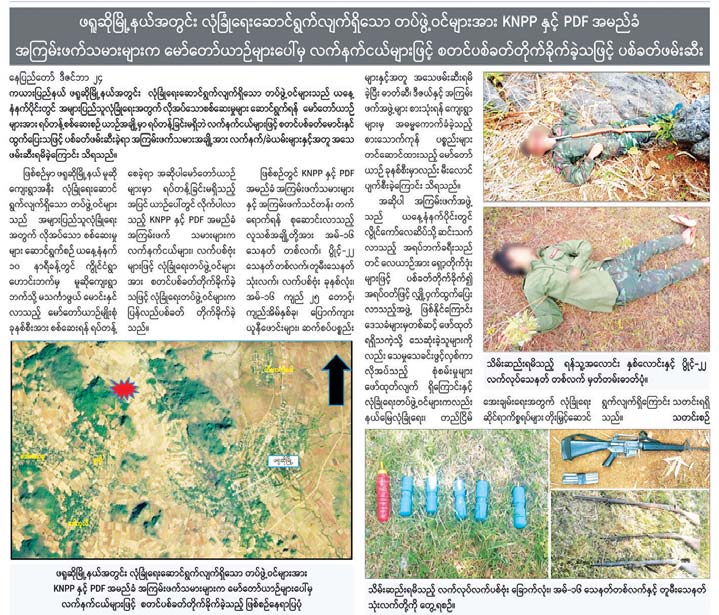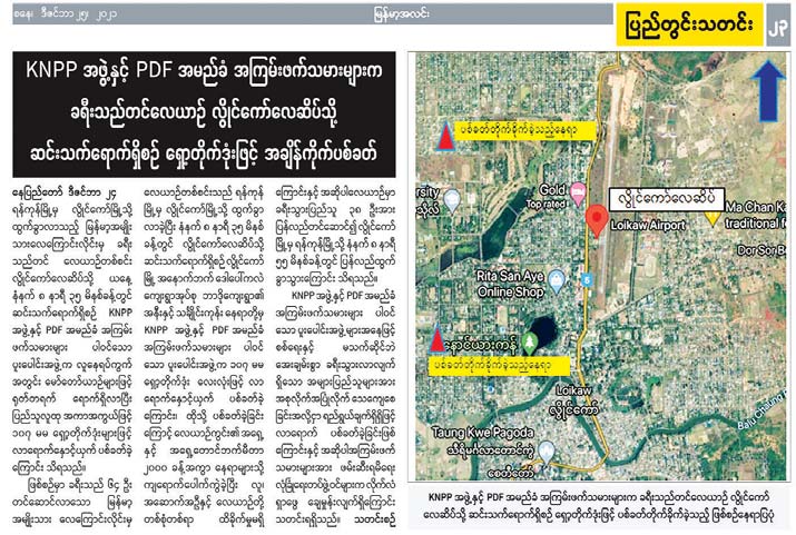 ဖြစ်စဉ်တွင် KNPP နှင့် PDF အမည်ခံ အကြမ်းဖက်သမားများနှင့် အကြမ်းဖက်သင်တန်း တက်ရောက်ရန် စုဆောင်းလာသည့် လူသစ်အချို့တို့အား အမ်-၁၆ သေနတ် ၁ လက်၊ ပွိုင့်-၂၂ သေနတ် ၁ လက်၊ တူမီးသေနတ် ၃ လက်၊ လက်ပစ်ဗုံး ၇ လုံး၊ အမ်-၁၆ ကျည် ၂၅ တောင့်၊ ကျည်အိမ် ၂ ခု၊ ပြောက်ကျား ယူနီဖောင်းများ၊ ဆက်စပ်ပစ္စည်းများနှင့်အတူ အသေဖမ်းဆီးရမိ ခဲ့ပြီး ဓာတ်ဆီ၊ ဒီဇယ်နှင့် အကြမ်းဖက် အဖွဲ့များ စားသုံးရန် ကျေးရွာများမှ အဓမ္မကောက်ခံခဲ့ သည့် စားသောက်ကုန် ပစ္စည်းများ တင်ဆောင်ထားသည့် မော်တော်ယာဉ် ၇ စီးမှာလည်း မီးလောင်ပျက်စီးခဲ့သည်။ အဆိုပါအကြမ်းဖက်အဖွဲ့သည် ယင်းနေ့ နံနက်ပိုင်းတွင် လွိုင်ကော်လေဆိပ်သို့ ဆင်းသက်လာသည့် အရပ်ဘက်ခရီးသည်တင်လေယာဉ်အား ရှော့တိုက်ဒုံးများဖြင့် ပစ်ခတ်တိုက်ခိုက်၍ အရပ်ဝတ်ဖြင့် လျှို့ဝှက်ထွက်ပြေးလာသည့် အဖွဲ့ဖြစ်ကြောင်း ဒေသခံများမှ တစ်ဆင့် ဖော်ထုတ်ရရှိခဲ့သည်။ ၎င်းဖြစ်စဉ်အားလည်း ၂၀၂၁ ခုနှစ်၊ ဒီဇင်ဘာ ၂၄ ရက်နေ့တွင် နိုင်ငံတော်ပိုင် ရုပ်သံလိုင်းများနှင့် သတင်းစာများတွင် ထုတ်ပြန်ခဲ့ပြီးဖြစ်သည်။