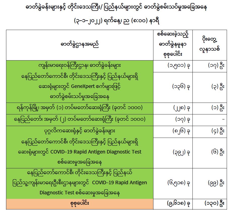 သို့ဖြစ်ပါ၍ ယနေ့အထိ ဓာတ်ခွဲနမူနာစုစုပေါင်း (၆,၀၆၅,၄၉၀) ခုအား စစ်ဆေးခဲ့ပြီး COVID-19 ဓာတ်ခွဲအတည်ပြုလူနာ စုစုပေါင်း (၅၃၁,၁၅၅) ဦး ရှိပြီ ဖြစ်ပါသည်။