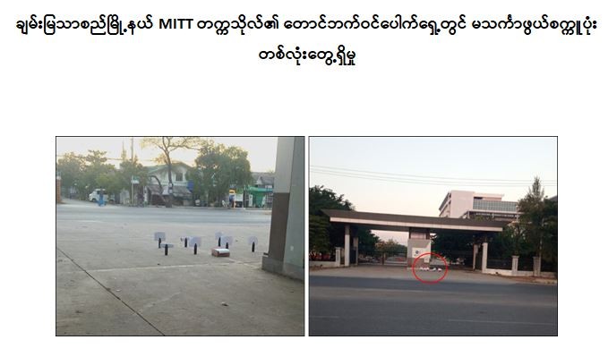 အလားတူ ယနေ့ နံနက် ၆ နာရီ ၅၀ မိနစ်အချိန်တွင် မန္တလေးတိုင်းဒေသကြီး၊ ချမ်းမြသာစည် မြို့နယ်၊ မြို့သစ်(၂)ရပ်ကွက် (၇၃) လမ်း၊ ၁၀၇ လမ်းနှင့် ၁၀၈ လမ်းကြားရှိ MITT တက္ကသိုလ်၏ တောင်ဘက်ဝင်ပေါက်ရှေ့တွင် မသင်္ကာဖွယ်စက္ကူပုံး တစ်လုံး တွေ့ရှိကြောင်း သတင်းအရ လုံခြုံရေးတပ်ဖွဲ့ဝင်များက သွားရောက်စစ်ဆေးခဲ့ရာ အဆိုပါတက္ကသိုလ်၏ တောင်ဘက် ဝင်ပေါက်ရှေ့တွင် အကြမ်းဖက်သမားများက ပုလင်း ၇ လုံး၌ ဆန့်ကျင်စာသားများ ကပ်၍ ထောင်ထားပြီး အဆိုပါပုလင်းများအလယ်၌ ကတ္ထုပုံးတစ်လုံးအား ထားရှိသည်ကို တွေ့ရှိရ သဖြင့် စစ်ဆေးရန်ပြုလုပ်နေစဉ် အဆိုပါပုံအတွင်းမှ ပေါက်ကွဲမှုဖြစ်ပွားခဲ့ပြီး ပေါက်ကွဲမှုကြောင့် လူနှင့်အဆောက်အဦ ထိခိုက်ပျက်စီးမှုမရှိကြောင်း သိရသည်။