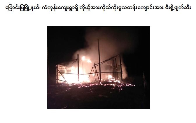 ဖြစ်စဉ်မှာ ယနေ့ နံနက် ၁ နာရီ ၁၀ မိနစ်အချိန်တွင် မြောင်းမြမြို့နယ် ကံကုန်းကျေးရွာရှိ ပြည်သူများက ကံကုန်းကျေးရွာနှင့် အနီးပတ်ဝန်းကျင်ရွာများမှ ကျောင်းနေအရွယ် ကလေး သူငယ်များ ပညာသင်ကြားနိုင်ရေးအတွက် ကျေးရွာအစီအစဉ်ဖြင့် တည်ဆောက်ထားပြီး သင်ကြားမှုပေးလျက်ရှိသည့် ကိုယ့်အား ကိုယ်ကိုး မူလတန်းကျောင်းအား မလိုလားသူ အကြမ်းဖက်သမားများက မီးရှို့ဖျက်ဆီးခဲ့သဖြင့် ကျေးရွာနေ ပြည်သူများက ဝိုင်းဝန်းမီးငြိမ်း သတ်ခဲ့ရာ နံနက် ၁ နာရီ ၁၅ မိနစ်အချိန်တွင် မီးငြိမ်းသွားခဲ့သည်။