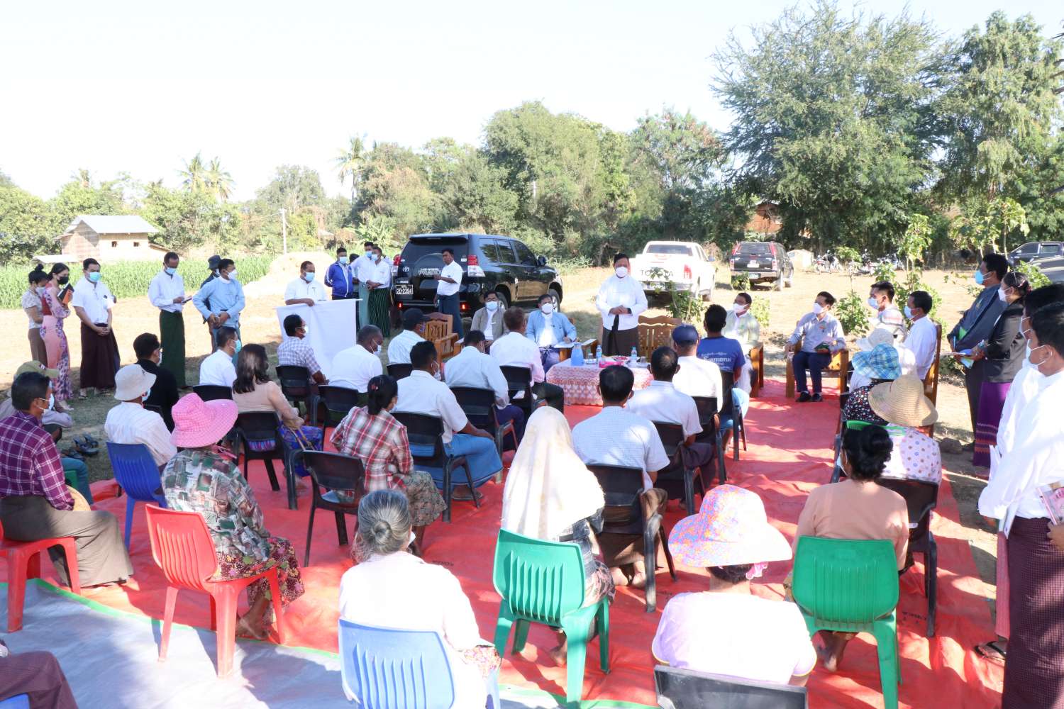 ရှေးဦးစွာ ပြည်ထောင်စုဝန်ကြီးနှင့်အဖွဲ့သည် တပ်ကုန်းမြို့နယ်၊ ဂွေးပင်စံပြကျေးရွာသို့ ရောက်ရှိပြီး ဒေသခံတောင်သူများတွေ့ဆုံကာ မိမိတို့ဝန်ကြီးဌာန အနေဖြင့် နေပြည်တော်ကောင်စီ နယ်မြေအတွင်း ခေတ်မီစံပြကျေးရွာ (Smart Village) များ ဖြစ်ပေါ်စေရေးအတွက် ကျေးရွာ (၃) ရွာကို ဦးစားပေးရွေးချယ်၍ အကောင်အထည်ဖော် ဆောင်ရွက်နေပါကြောင်း၊ ဂွေးပင်စံပြ ကျေးရွာ၏ ခေတ်မီစက်မှုလယ်ယာစနစ်နှင့် Contract Farming စနစ် အကောင်အထည်ဖော် ဆောင်ရွက်နိုင်ရေးအတွက် စိုက်ပျိုးရေး၊ မွေးမြူရေးနှင့် ဆည်မြောင်းဝန်ကြီးဌာန၊ စက်မှု လယ်ယာဦးစီးဌာနမှ Focal အဖြစ် တာဝန်ယူဆောင်ရွက်ပြီး သမဝါယမနှင့် ကျေးလက် ဖွံ့ဖြိုးရေးဝန်ကြီးဌာနရှိ ဦးစီးဌာနများနှင့် ပေါင်းစပ် ညှိနှိုင်း ဆောင်ရွက်သွားမည်ဖြစ်ပါကြောင်း၊ ကျေးရွာရှိ တောင်သူ (၆၁) ဦးကို သမဝါယမ အသင်း ဖွဲ့စည်းပေး၍ လယ်မြေ (၁၁၄) ဧကတွင် အကောင်အထည်ဖော် ဆောင်ရွက်ပေး သွားမည်ဖြစ်ပါကြောင်း ပြောကြားသည်။
