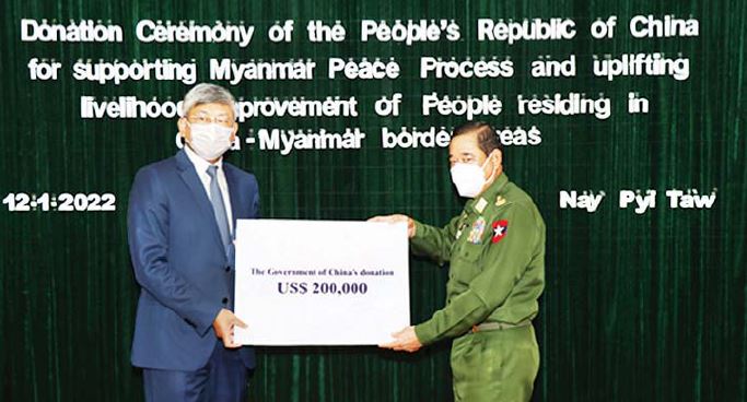 မြန်မာနိုင်ငံ၏ အပစ်အခတ်ရပ်စဲမှု၊ ငြိမ်းချမ်းရေးဖော်ဆောင်မှုတို့ကို တိုးမြှင့်ရန်နှင့်တရုတ်- မြန်မာ နယ်စပ် ဒေသ၌နေထိုင်သည့် ပြည်သူများ၏လူနေမှုဘဝ တိုးတက်ရေးတို့အတွက်ရည်ရွယ်၍ တရုတ်ပြည်သူ့သမ္မတ နိုင်ငံအစိုးရမှ နယ်စပ်ရေးရာဝန်ကြီးဌာနသို့ အမေရိကန်ဒေါ်လာ နှစ်သိန်း ပေးအပ်လှူဒါန်းခြင်းအခမ်းအနားကို ယနေ့နံနက်ပိုင်းတွင် နယ်စပ်ရေးရာဝန်ကြီးဌာနဝန်ကြီးရုံး အစည်းအဝေးခန်းမ၌ ကျင်းပသည်။