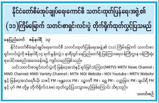 နိုင်ငံတော်စီမံအုပ်ချုပ်ရေးကောင်စီ သတင်းထုတ်ပြန်ရေးအဖွဲ့၏ (၁၁) ကြိမ်မြောက် သတင်းစာရှင်းလင်းပွဲ တိုက်ရိုက်ထုတ်လွှင်ပြသမည် 01/14/2022