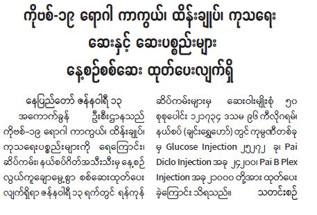 ကိုဗစ် − ၁၉ ရောဂါ ကာကွယ်၊ ထိန်းချုပ်၊ ကုသရေး ဆေးနှင့် ဆေးပစ္စည်းများ နေ့စဉ် စစ်ဆေးထုတ်ပေးလျက်ရှိ 01/14/2022