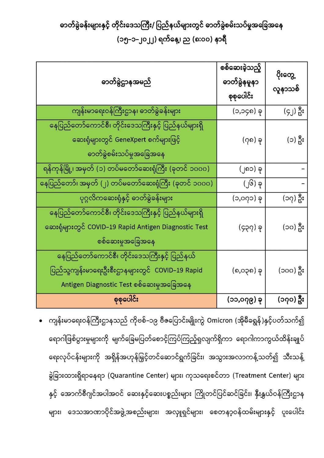 COVID-19 သံသယလူနာများ၊ ဓာတ်ခွဲအတည်ပြုလူနာနှင့် အနီးကပ်ထိတွေ့ခဲ့သူများနှင့် အသွား အလာ ကန့်သတ်ထားရှိသူများအား COVID-19 ရောဂါ ရှိ၊ မရှိ ဓာတ်ခွဲစမ်းသပ်စစ်ဆေးခြင်းအား ပုံမှန်ဆောင်ရွက်လျက်ရှိပြီး (၁၄-၁-၂၀၂၂) ရက်နေ့၊ ည (၈:၀၀) နာရီမှ (၁၅-၁-၂၀၂၂) ရက်နေ့၊ ည (၈:၀၀) နာရီအတွင်း ဓာတ်ခွဲနမူနာစုစုပေါင်း (၁၁,၀၇၉) ခုအား စစ်ဆေးပြီးစီးခဲ့ရာ COVID-19 ရောဂါ ဓာတ်ခွဲ အတည်ပြုလူနာသစ် (၁၇၀) ဦး တွေ့ရှိရပါသည်။ ထို့ကြောင့် ယနေ့အတွက် ရောဂါပိုး တွေ့ရှိမှု ရာခိုင်နှုန်းမှာ (၁.၅၃) ရာခိုင်နှုန်း ရှိပါသည်။
