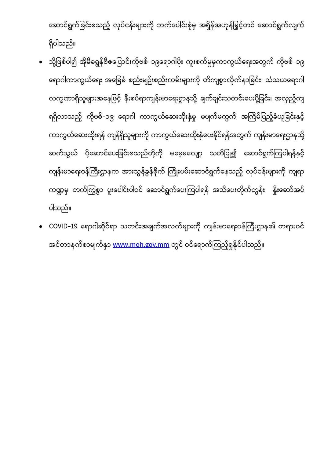 ကျန်းမာရေးဝန်ကြီးဌာနအနေဖြင့် နိုင်ငံအတွင်း ကူးစက်ဖြစ်ပွားနေသော COVID-19 ရောဂါ ကာကွယ်၊ ကုသ၊ ထိန်းချုပ်ရေးလုပ်ငန်းများကို အရှိန်အဟုန်မြှင့် ဆောင်ရွက်လျက်ရှိပါသည်။