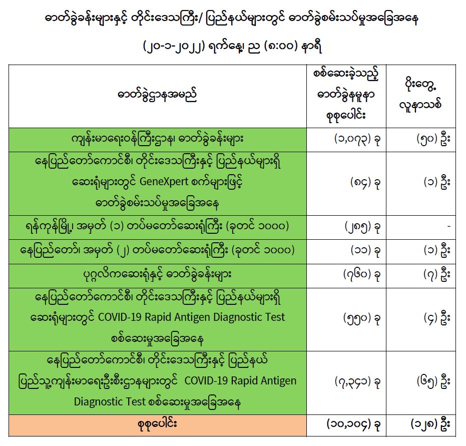 သို့ဖြစ်ပါ၍ ယနေ့အထိ ဓာတ်ခွဲနမူနာစုစုပေါင်း (၆,၂၄၄,၆၆၃) ခုအား စစ်ဆေးခဲ့ပြီး COVID-19 ဓာတ်ခွဲအတည်ပြုလူနာ စုစုပေါင်း (၅၃၃,၇၃၂) ဦး ရှိပြီ ဖြစ်ပါသည်။