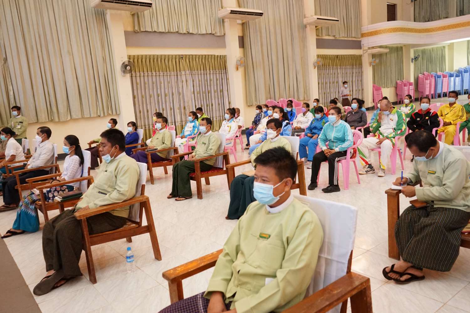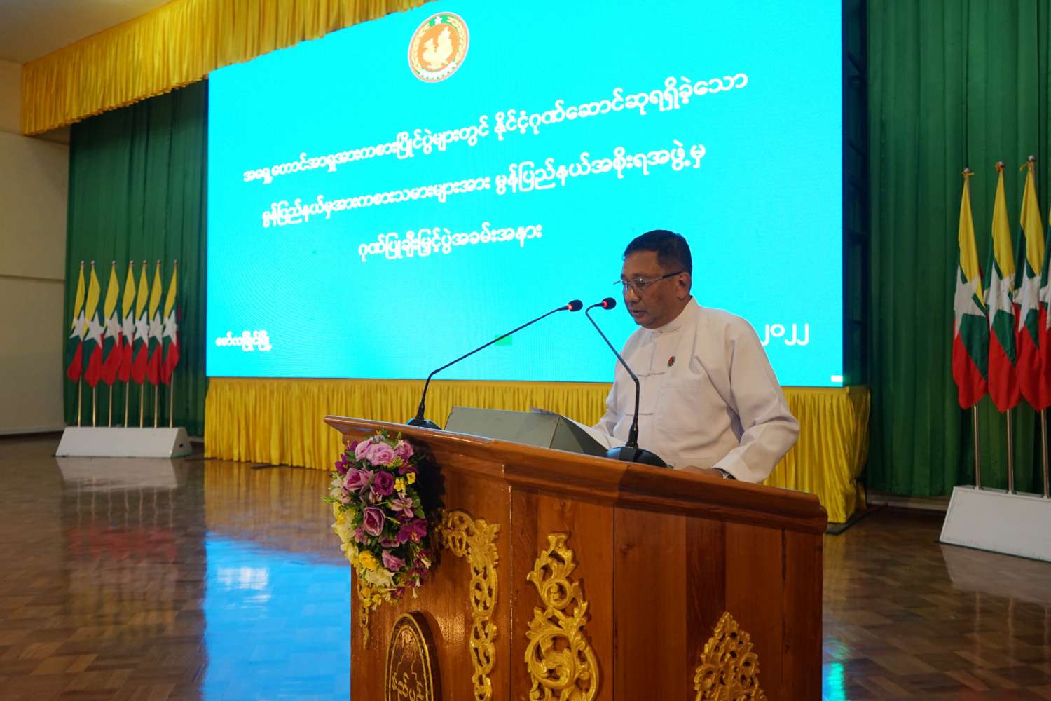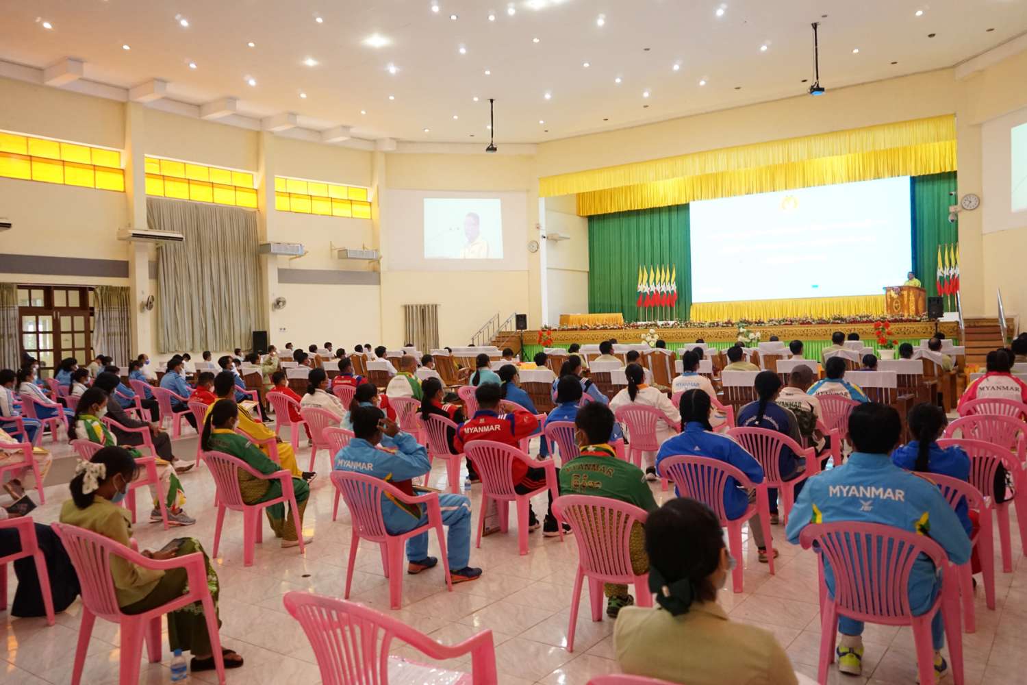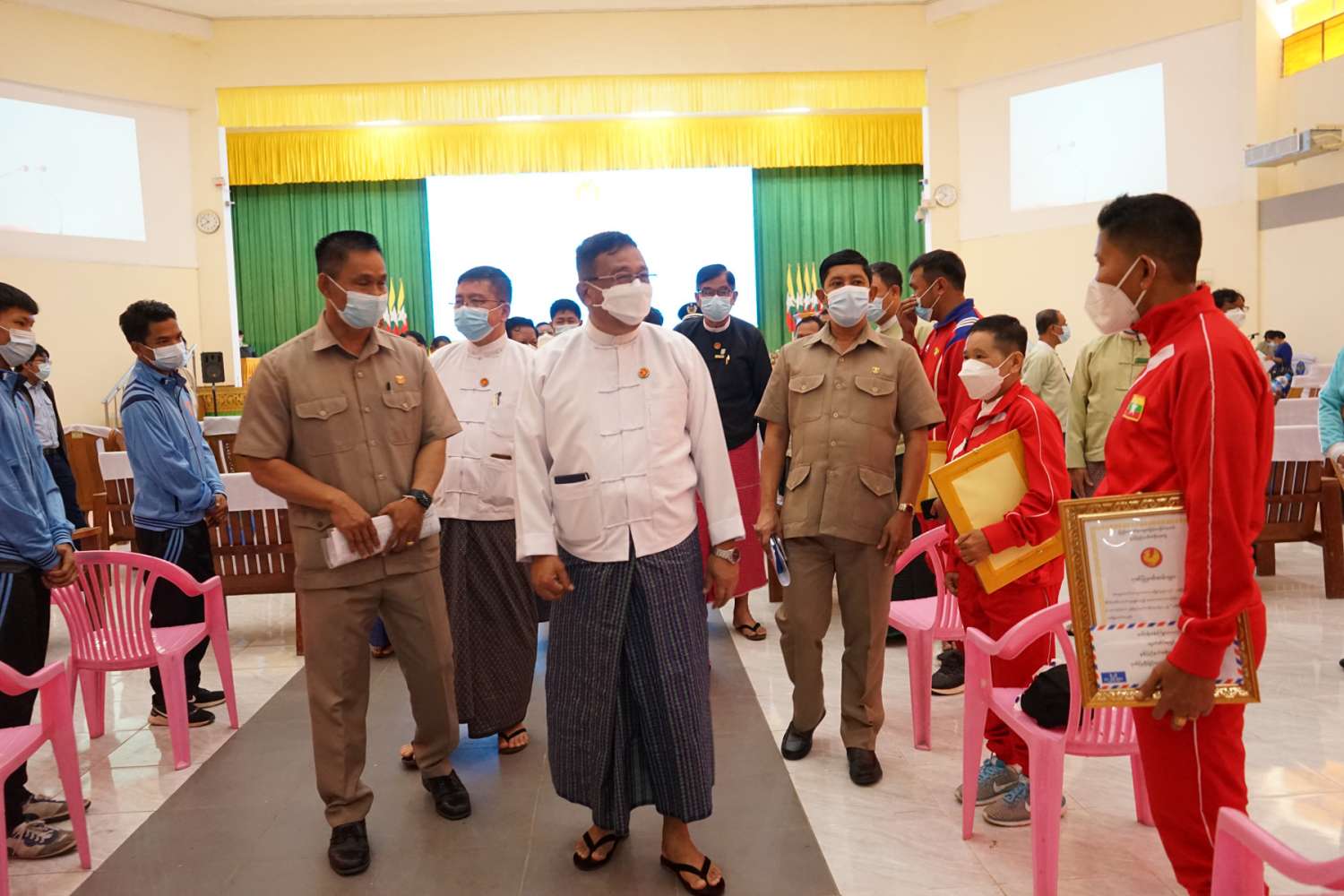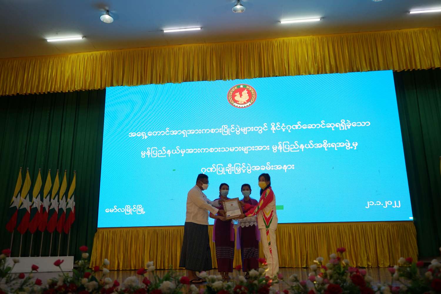 မွန်ပြည်နယ်မှ အရှေ့တောင်အာရှ အားကစားပြိုင်ပွဲများတွင် နိုင်ငံ့ဂုဏ်ဆောင်ဆု ရရှိခဲ့သည့် အားကစားသမားများအား ပြည်နယ်အစိုးရအဖွဲ့မှ ဂုဏ်ပြုဆုချီးမြှင့်ပေးအပ်ခြင်း အခမ်းအနားကို ယနေ့နံနက် ၁၀ နာရီ က မော်လမြိုင်မြို့ဖက်တန်းရပ်၊ ပြည်နယ်ခန်းမတွင် ကျင်းပခဲ့ရာ မွန်ပြည်နယ်ဝန်ကြီးချုပ် ဦးဇော်လင်းထွန်း၊ ပြည်နယ်ဝန်ကြီးများ၊ ဌာနဆိုင်ရာတာဝန်ရှိသူများနှင့် နိုင်ငံ့ဂုဏ်ဆောင် ထူးချွန်အားကစားသမားများ တက်ရောက်ကြသည်။