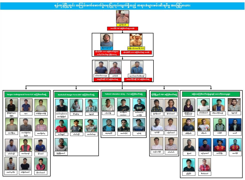 NUG အကြမ်းဖက်အဖွဲ့မှ PDF အကြမ်းဖက်အဖွဲ့ ဖွဲ့စည်း၍ တောင်ပိုင်းတိုင်း PDF အကြမ်းဖက်အဖွဲ့အား လွင်ကိုလတ် မှ တာဝန်ခံအဖြစ် ဆောင်ရွက်ကာ နိုင်ငံတော်အစိုးရ၏ အုပ်ချုပ်ရေးယန္တရား ပျက်ပြားစေရန်နှင့် ပြည်သူလူထုအထိတ် တလန့်ဖြစ်စေရန်အတွက် အကြမ်းဖက်လုပ်ငန်းများ ဆောင်ရွက်ခဲ့ပြီး လွင်ကိုလတ် ၏ စေခိုင်းချက်အရ တရားခံ မောင်ကျော်(ခ)ဖြိုးဇေယျာသော် သည် STF အကြမ်းဖက် အဖွဲ့နှင့် PDF အကြမ်းဖက်အဖွဲ့တို့၏ တာဝန်ခံအဖြစ်လည်းကောင်း၊ ရန်ကုန်တိုင်း ပကဖ အကြမ်းဖက်အဖွဲ့တာဝန်ခံအဖြစ် ဝေဖြိုးဟန်(ခ)နောင်ရိုး မှ ဆောင်ရွက်ပြီး အရှေ့ပိုင်း ခရိုင်တာဝန်ခံ လင်းထက်(ခ)မဟူရာ၊ အနောက်ပိုင်းခရိုင် တာဝန်ခံ နေလင်းအောင် (ခ)ဖိုးကျော်၊ တောင်ပိုင်းခရိုင် တာဝန်ခံ ထက်ဇော်၊ မြောက်ပိုင်းခရိုင် တာဝန်ခံ မင်းရန်နိုင် တို့ဖြင့် ခရိုင် ၄ ခုခွဲ၍ ဖွဲ့စည်းကာ ရန်ကုန်တိုင်းဒေသကြီးအတွင်း အကြမ်းဖက် လုပ်ငန်းများအား ပိုမိုအရှိန်မြှင့်တင် လုပ်ဆောင်စေ ခဲ့ကြောင်း ဖော်ထုတ်သိရှိရသည်။