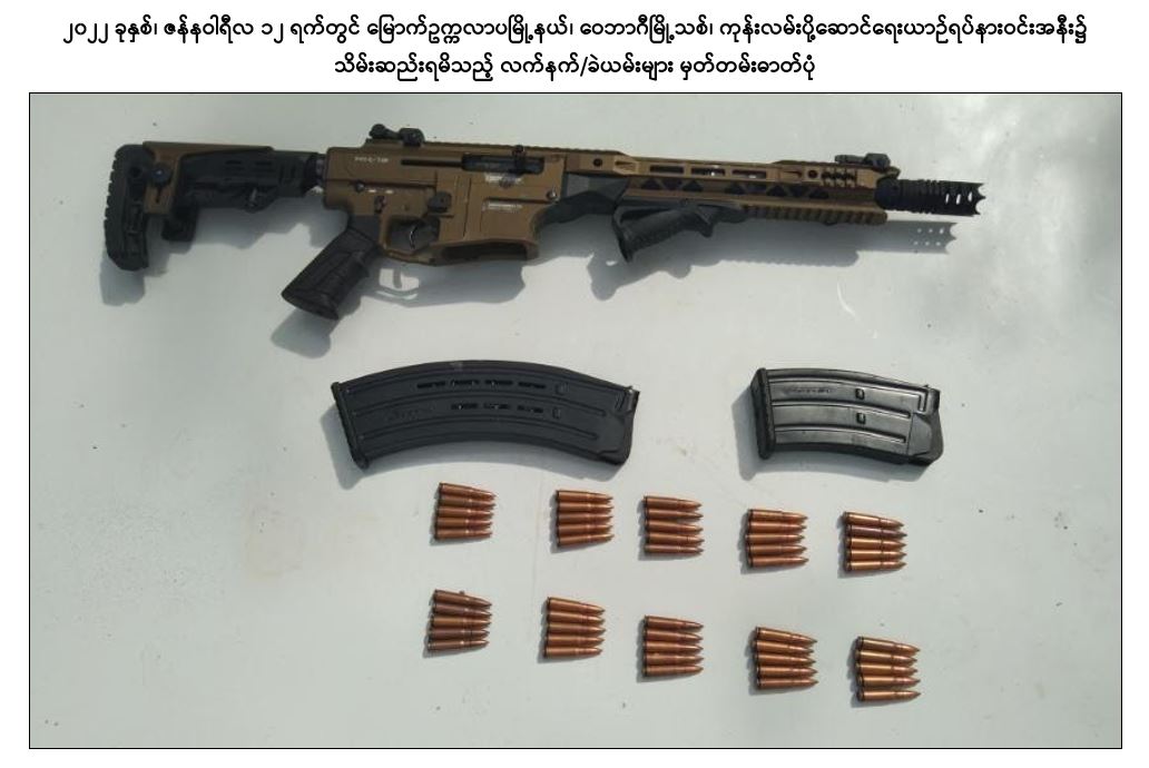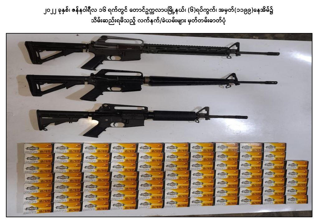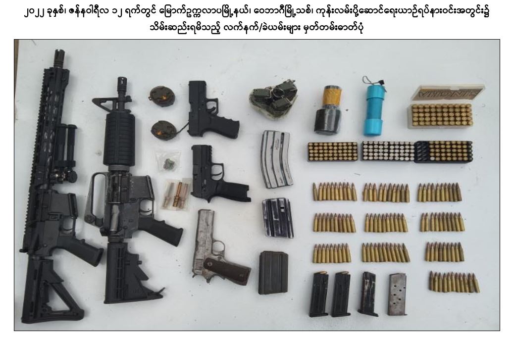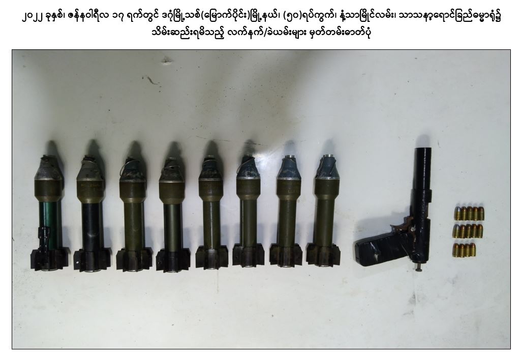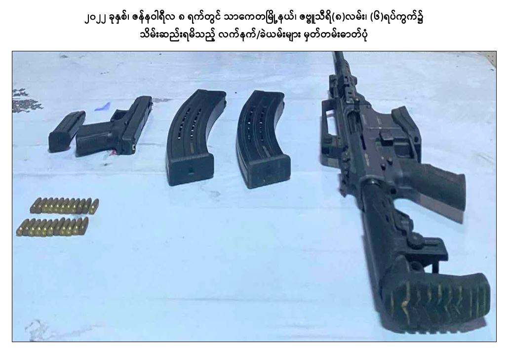 အကြမ်းဖက်အဖွဲ့အစည်းများဖြစ်သည့် CRPH၊ NUG နှင့် PDF အဖွဲ့များမှ အကြမ်းဖက်လုပ်ရပ်များ ဆောင်ရွက်နိုင်မှုမရှိစေရေး သတင်းလက်ဦးမှုရယူ၍ ဖော်ထုတ် ဖမ်းဆီးခြင်းများ ဆောင်ရွက်လျက်ရှိရာ ၂၀၂၂ ခုနှစ်၊ ဇန်နဝါရီလ ၆ ရက်တွင် ကြည့်မြင်တိုင်မြို့နယ်၊ ပန်းလှိုင်အိမ်ရာ၊ တိုက်အမှတ်(၃)၊ အခန်း(၄၄)၌ ရန်ကုန်တိုင်း ပကဖ အကြမ်းဖက်အဖွဲ့ အရှေ့ပိုင်းခရိုင်တာဝန်ခံ လင်းထက်(ခ)မဟူရာ (၃၆)နှစ်နှင့် ဇော်ကိုကို(၃၅)နှစ်တို့ ၂ ဦးအား Sigsauer ပစ္စတို ၂ လက်၊ ၎င်းကျည်အိမ် ၂ ခု၊ ၉ မမ ကျည် ၃၀ တောင့်၊ MK-12 သေနတ် ၂ လက်၊ ၎င်းကျည်အိမ် ၂ ခု၊ ၎င်းကျည် ၂၀ တောင့်၊ M-79 သေနတ် ၁ လက်တို့နှင့်အတူ ဖမ်းဆီးရမိခဲ့သည်။