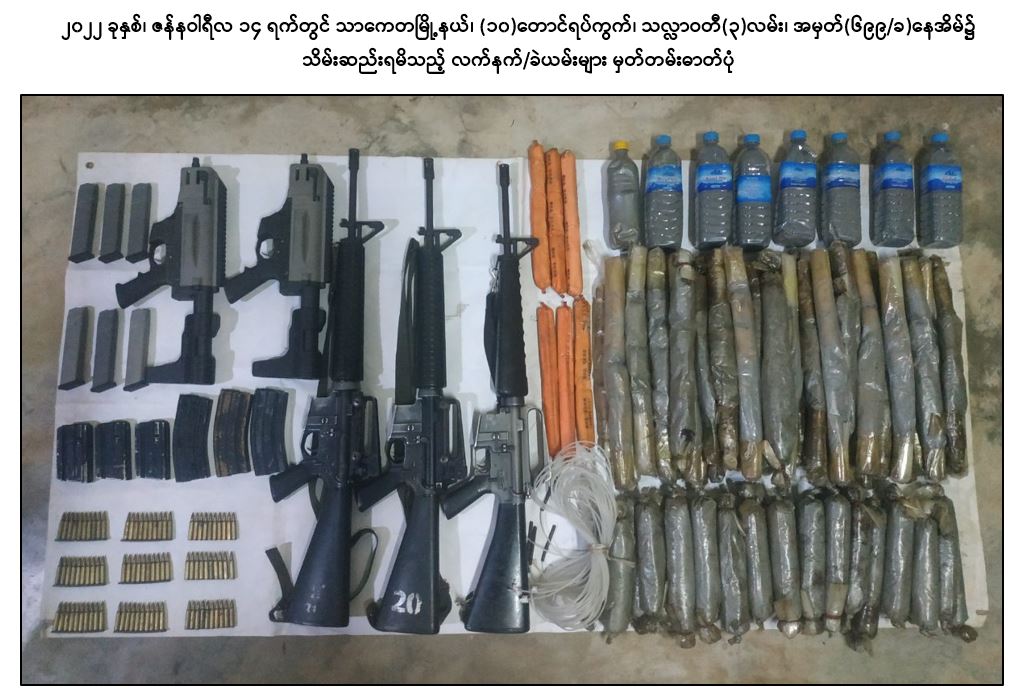 ဖမ်းဆီးရမိတရားခံများ၏ ထွက်ဆိုချက်အရ ဇန်နဝါရီလ ၁၄ ရက် နံနက်ပိုင်း တွင် သာကေတမြို့နယ်၊ (၁၀)တောင်ရပ်ကွက်၊ သလ္လာဝတီ(၃)လမ်းရှိ နေအိမ်အား ဝင်ရောက်ရှာဖွေခဲ့ရာ M-16 ၃ လက်၊ FCG-9 ၂ လက်၊ M-16 ကျည်အိမ် ၆ ခု၊ FCG-9 ကျည်အိမ် ၆ ခု၊ ၅.၅၆ ကျည် ၉၀ တောင့်၊ ယမ်းတောင့် မျိုးစုံ ၇၈ တောင့်၊ ယမ်းကြိုး ၆ ချောင်း၊ ဒီတိုနေတာ ၆ ခု၊ ယမ်းစိမ်း ၈ ဘူးတို့အား သိမ်းဆည်းရမိခဲ့သည်။