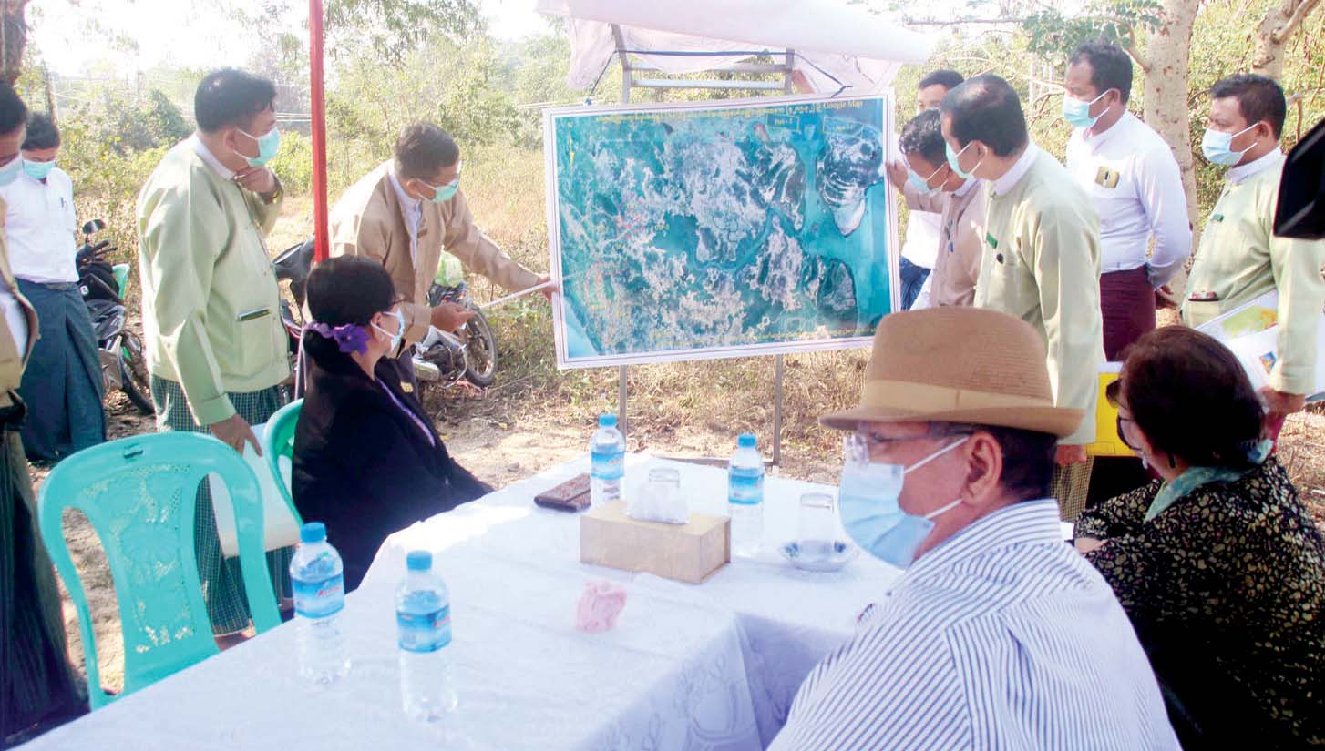 ထို့နောက် နိုင်ငံတော်စီမံအုပ်ချုပ်ရေးကောင်စီအဖွဲ့ဝင် ဒေါ်အေးနုစိန်နှင့်အဖွဲ့သည် သိုင်းချောင်းကျေးရွာ လမ်းဆုံရှိ ယာယီရှင်းလင်းဆောင်၌ ဧက ၂၅၀ မြေနေရာတွင် SEZ အကောင်အထည်ဖော် ဆောင်ရွက် မည့် လုပ်ငန်းအခြေအနေကို ကြည့်ရှုစစ်ဆေးရာ ကျောက်ဖြူအထူး စီးပွားရေးဇုန်စီမံခန့်ခွဲမှု ကော်မတီဥက္ကဋ္ဌ ဦးမြင့်သိန်းကကော်မတီ၏ လုပ်ငန်းဆောင်ရွက်မှုအဆင့်ဆင့်ကို ရှင်းလင်းတင်ပြခဲ့ကြောင်း သိရသည်။
