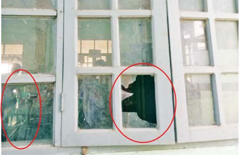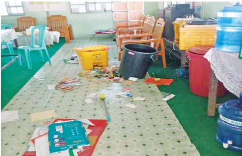 အလားတူ မွန်းလွဲ ၁ နာရီခန့်တွင် အမှတ်(၄)ရပ်ကွက်၊ အနော်ရထာလမ်း၊ အမှတ်(၁)အခြေခံပညာမူလတန်းကျောင်းရှိ ကျောင်းအုပ်ကြီးရုံးခန်း ပြတင်းပေါက် များအား အကြမ်းဖက်သမားများက ရိုက်ခွဲဖျက်ဆီး၍ ရုံးခန်းအတွင်းသို့ဝင်ရောက်ကာ ခြိမ်းခြောက်စာရေးသားပြီး စာရွက် စာတမ်းများနှင့် ကျောင်းသုံးပရိဘောဂပစ္စည်း များအား ဖြန့်ကြဲဖျက်ဆီးထားခဲ့ကြောင်း သိရှိရသည်။