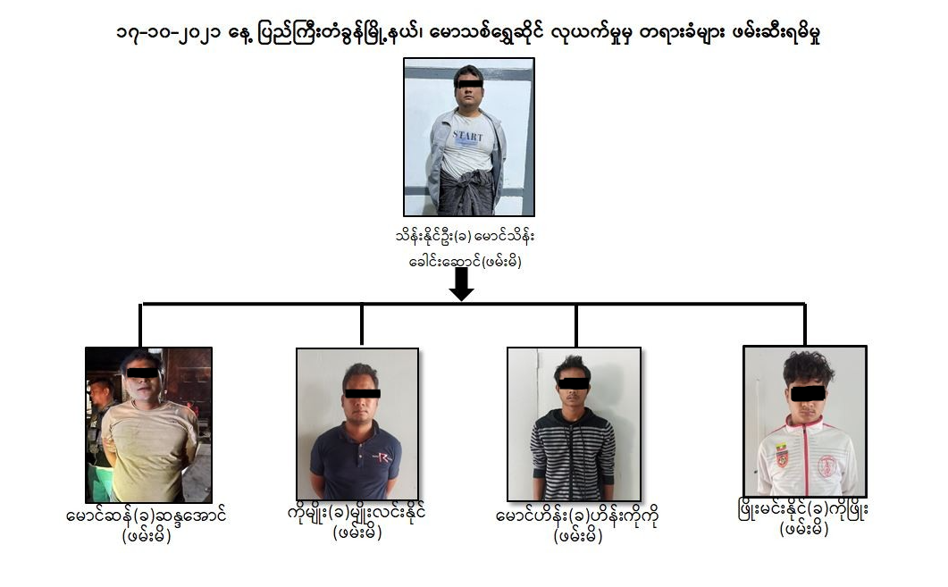 ဆက်လက်၍ အထူးအမှုစစ်အဖွဲ့သည့် ပြစ်မှုကျူးလွန်ခဲ့သူများအား ဖမ်းဆီးရမိရေးဆောင်ရွက် ခဲ့ရာ စစ်ကိုင်းတိုင်းဒေသကြီး၊ မြောင်မြို့နယ်၊ ပရိမ္မကျေးရွာနေ မောင်ဟိန်း (ခ) ဟိန်းကိုကို (၂၈)နှစ်အား ဆိုင်ကယ် ၁ စီးနှင့်အတူ ဇန်နဝါရီလ ၁၇ ရက်နေ့တွင် မဟာအောင်မြေမြို့နယ်ရှိ ၎င်း၏နေအိမ်၌လည်းကောင်း၊ ကျောက်ပန်းတောင်းမြို့နယ်၊ လွပ်လပ်ရေးရပ်ကွက်၊ အမှတ် (၅၈၈)နေ ထင်အောင်ကျော် (၃၁)နှစ်အား ဆိုင်ကယ် ၁ စီး၊ ငွေကျပ် ၃၄၅,၀၀၀ ကျပ်၊ “ဝိန့်လီ"ရွှေဆိုင်ဓားပြတိုက်ရာမှ ရရှိခဲ့သည့် ရွှေဆွဲကြိုး ၂ တုံးနှင့် လက်ကောက် ၃ ကွင်းအား အရည်ကြိုထားသည့် ရွှေတုံး ၃ တုံးနှင့်အတူ ဇန်နဝါရီလ ၁၈ ရက်နေ့ ည ၇ နာရီခွဲ အချိန်တွင် တောင်ကြီးမြို့တွင် လည်းကောင်း၊ စစ်ကိုင်းတိုင်းဒေသကြီး၊ မြောင်မြို့နယ်၊ မရိုးကုန်းကျေးရွာ နေသူများဖြစ်သည့် ဇော်ဇော်နိုင်(၃၀)နှစ်နှင့် ဖြိုးမင်းနိုင်(ခ) ကိုဖြိုး (၂၂)နှစ်တို့အား “မောသစ်”ရွှေဆိုင်လုယက်စဉ်ရရှိခဲ့သည့် ရွှေဆွဲကြိုးအပြတ် ၁ ကုံး၊ “ဝိန့်လီ” ရွှေဆိုင် ဓားပြတိုက်စဉ်က ရရှိခဲ့သည့် ရွှေဆွဲကြိုး ၃ တို့နှင့်အတူ ဇန်နဝါရီလ ၂၄ ရက်နေ့ နံနက် ၁၁ နာရီခွဲအချိန်တွင် ဇော်ဇော်နိုင်၏ နေအိမ်တွင် လည်းကောင်း၊ မန္တလေးတိုင်းဒေသကြီး၊ မဟာအောင်မြေ မြို့နယ်၊ အကြော်စုရပ်ကွက်၊ (၃၇)လမ်းနှင့် (၃၈)လမ်းကြား (၈၅)လမ်းနှင့် (၈၆)လမ်းကြားနေ သိန်းနိုင်ဦး(ခ)မောင်သိန်း(၃၈)နှစ်နှင့် ၎င်း၏တပည့်ဖြစ်သူ အောင်နိုင်မိုး(၂၅)နှစ် တို့အားပစ္စတိုသေနတ် (၁)လက်၊ ၎င်းကျည် ၁၅ တောင့်၊ လက်ပစ်ဗုံး (၂)လုံး၊ တိုက်ရာပါရွှေထည် ပစ္စည်းများ နှင့်အတူ စစ်ကိုင်း မြို့၊ အိုးဘိုရပ်ကွက်၌ ဇန်နဝါရီလ ၂၆ ရက်နေ့ ည ၁၀ နာရီ ၅၀ မိနစ်အချိန်တွင် လည်းကောင်း၊ စစ်ကိုင်း တိုင်းဒေသကြီး၊ မြောင်မြို့နယ်၊ အလယ်ရပ်ကွက်နေ မောင်ဆန်(ခ) ဆန္ဒအောင်(၃၄)နှစ်၊ ဇနီးဖြစ်သူ မြတ်သူဇာ(၃၅)နှစ်နှင့် မြင်းမူမြို့နယ်၊ ကုလားတန်းရပ်ကွက်၊ မင်းရဲကျော်စွာရပ်နေ အောင်ဖြိုးပိုင်(ခ) အငယ်လေး(၂၃)နှစ်တို့ ၂ ဦးအား စစ်ကိုင်းမြို့၊ ဇေယျာတိုးချဲ့ ရပ်ကွက်၌ ပစ္စတို သေနတ်(၁)လက်၊ ကျည်ဆံ(၅)တောင့်တို့နှင့်အတူ အသီးသီးဖမ်းဆီးရမိခဲ့ပါသည်။